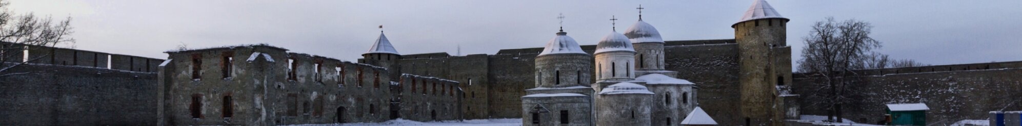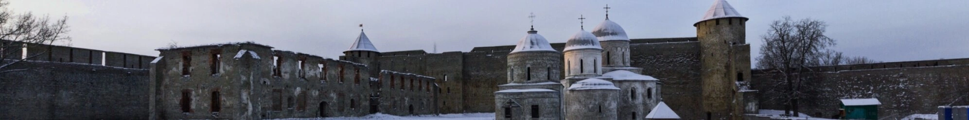 На фотографии можно наблюдать монументальную красоту каменной кладки, мощь крепостных стен, надежно укрывающих домы Божии, и благородную простоту их архитектурных форм. Зимний пейзаж подчеркивает суровый и аскетичный характер северной русской архитектуры, ее духовную силу и steadfastness. Вид частично отреставрированных сооружений напоминает о непрерывном труде по сохранению нашего национального и духовного наследия. Этот образ служит напоминанием о глубоких исторических корнях Православия на северо-западных землях России и призывает к молитвенной памяти о тех, кто созидал и защищал эту священную твердыню.
