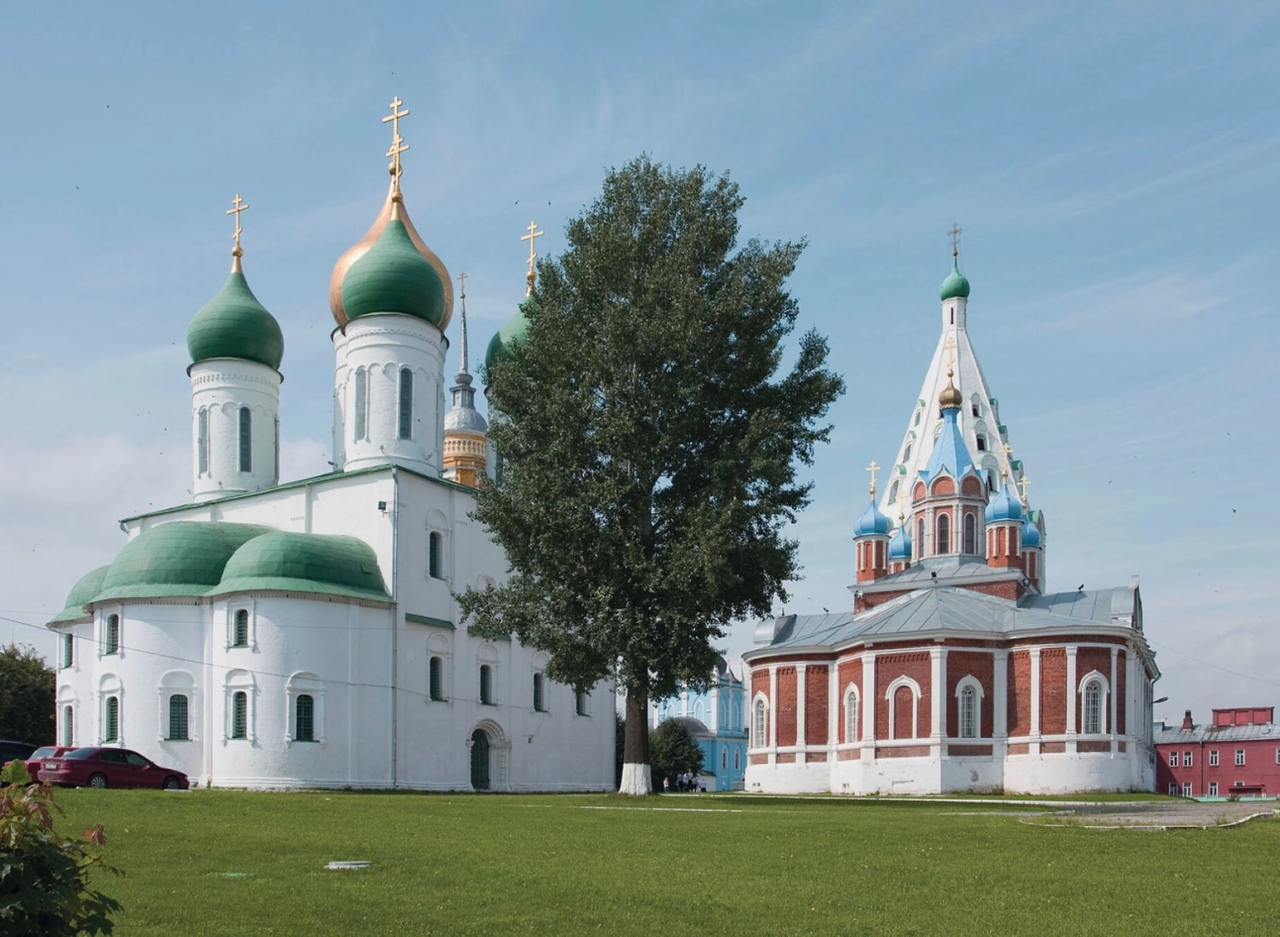Оба храма расположены на ухоженном зеленом газоне, между ними растет раскидистое лиственное дерево, создающее естественное обрамление для святых обителей. На заднем плане просматриваются другие исторические постройки Коломенского кремля, включая фрагмент красного здания. Небесный свод представлен ясной лазурью с легкими облачными образованиями. У левого края фотографии заметна часть современного транспортного средства, что создает интересный контраст эпох.