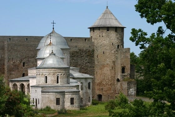 На представленной фотографии запечатлён величественный Успенский собор, расположенный на территории древней Ивангородской крепости. Храм освящён в честь Успения Пресвятой Богородицы и является одним из старейших православных соборов Северо-Запада России. Собор был возведён в первой половине XVI века, в период расцвета русского церковного зодчества, и служил духовным центром для защитников крепости и местных жителей.