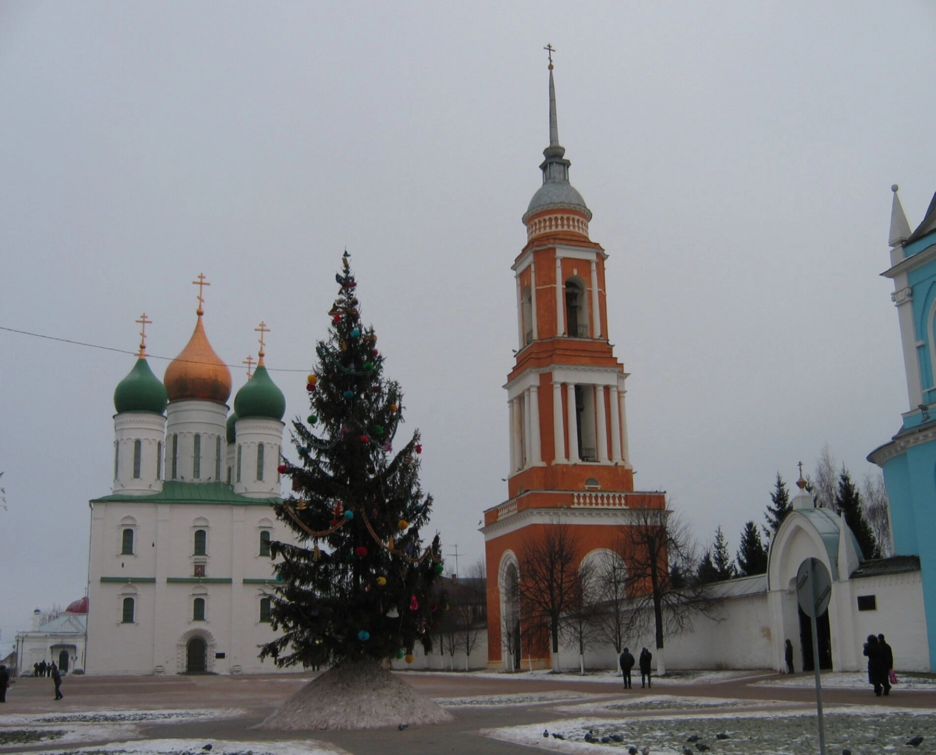 На переднем плане фотографии видна украшенная новогодняя ель, что свидетельствует о съёмке в период рождественских праздников. Архитектурный ансамбль Соборной площади Коломенского кремля представляет собой уникальный пример сохранения православных традиций в русском зодчестве. Успенский собор, являющийся доминантой площади, был построен на месте более древнего храма, где в 1380 году преподобный Сергий Радонежский благословил князя Димитрия Донского на Куликовскую битву.