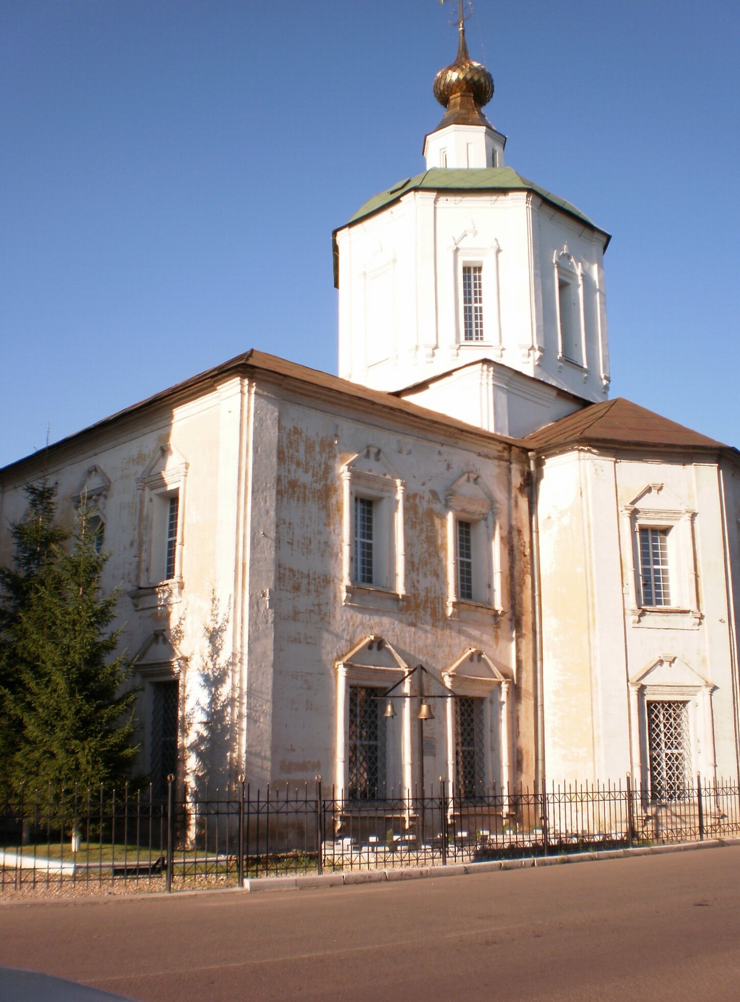 На снимке фасад здания освещён лучами солнца, что создаёт игру света и тени, подчёркивая величие и строгость архитектурных линий. Слева от собора видна хвойная зелень, символизирующая вечную жизнь, дарованную через веру. Купол, сияющий золотом, устремлён в небеса, напоминая о молитвенном предстоянии перед Господом.