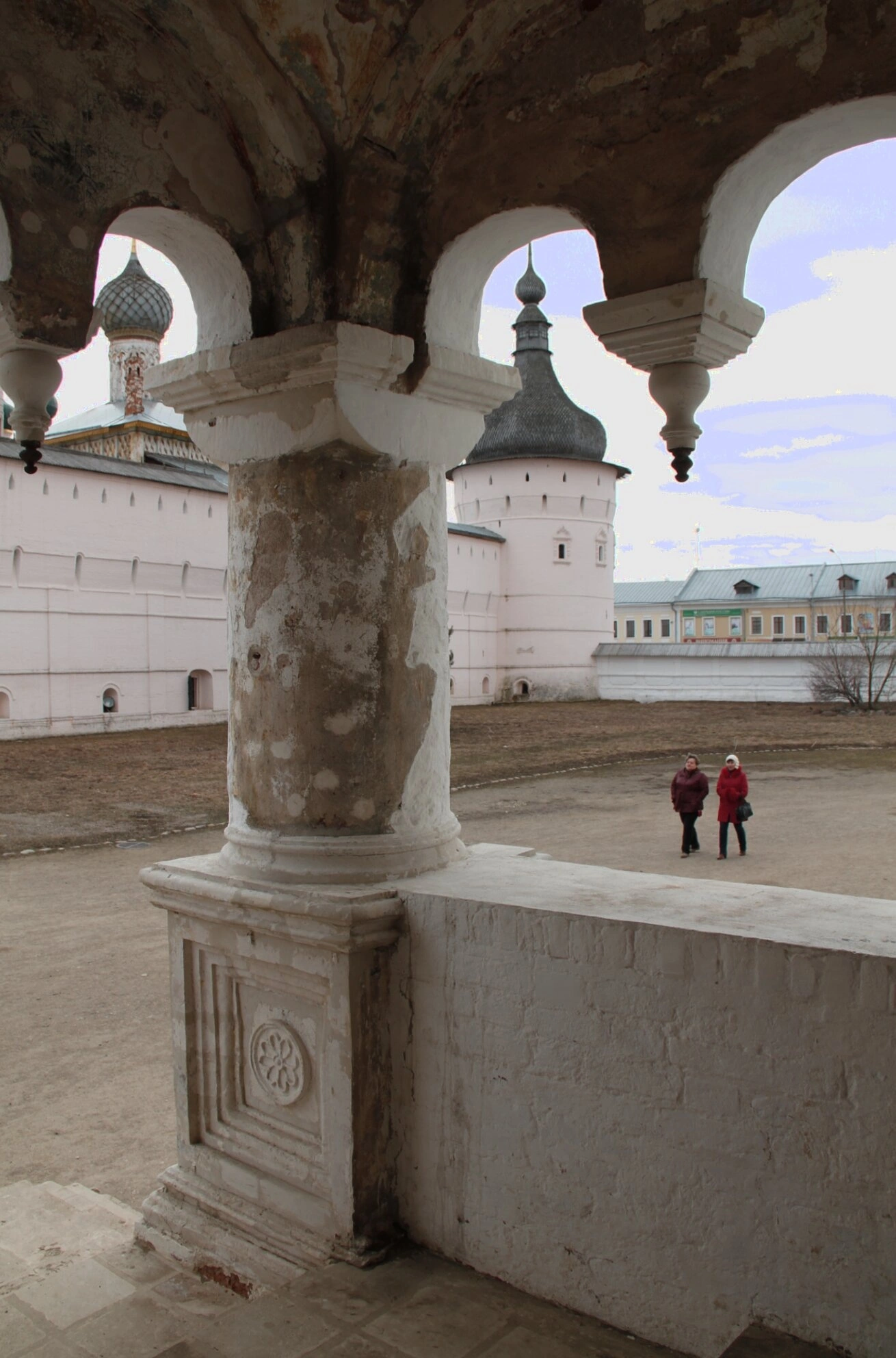 Через арку открывается вид на священную территорию кремля. С левой стороны возвышается Успенский собор — пятиглавый храм, основанный в XVI веке и являющийся усыпальницей ростовских архиереев. Его мощные стены и шлемовидные купола символизируют незыблемость православной веры. Справа расположена знаменитая соборная звонница с уникальным набором колоколов, известных своим особым звучанием.