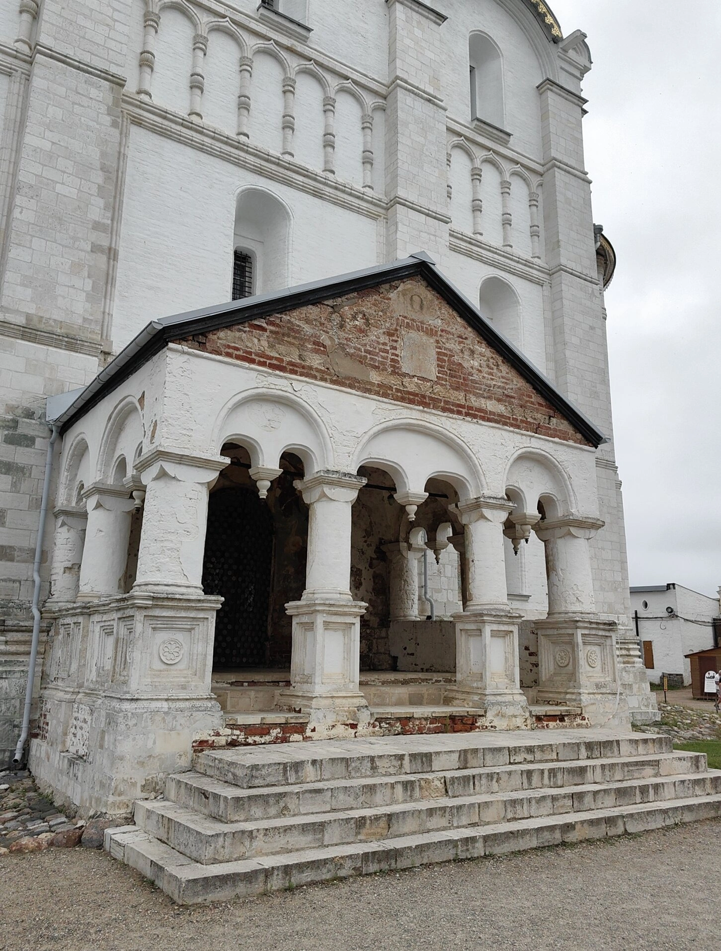 Паперть собора, изображенная на переднем плане, исторически служила местом сбора верующих перед богослужением и крестных ходов. Массивные каменные ступени и арочные проемы демонстрируют характерные черты русской церковной архитектуры XVI столетия. Портал западного входа украшен традиционным орнаментом и когда-то был расписан фресками, приглашая молящихся переступить порог дом Божия.