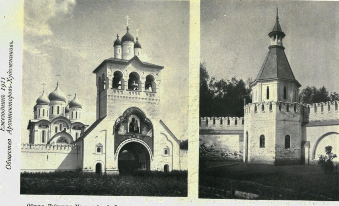 На снимке также запечатлена часть монастырской ограды, которая опоясывала святое место, создавая законченный архитектурный комплекс. К сожалению, надвратная звонница, находившаяся в западной стене ограды, была утрачена в советское время. Архитектурный ансамбль женской общины в Добрынихе представляет собой выдающийся пример церковного зодчества начала XX века, гармонично соединившего традиции древнерусской архитектуры с творческими находками эпохи модерна.