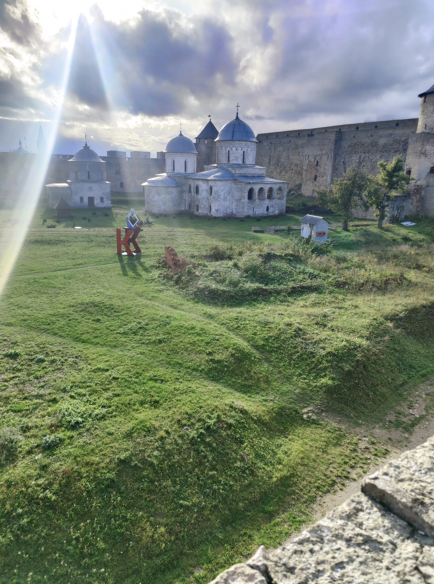 На переднем плане фотографии видны могучие крепостные стены и бастионы, свидетельствующие о former military might этого форпоста на западных рубежах Святой Руси. Зелёные склоны и исторический ландшафт вокруг крепости создают ощущение величия и неприступности. Небесная сфера в момент съёмки была частично покрыта облаками, сквозь которые пробивались божественные лучи солнца, символически освещая священную землю.