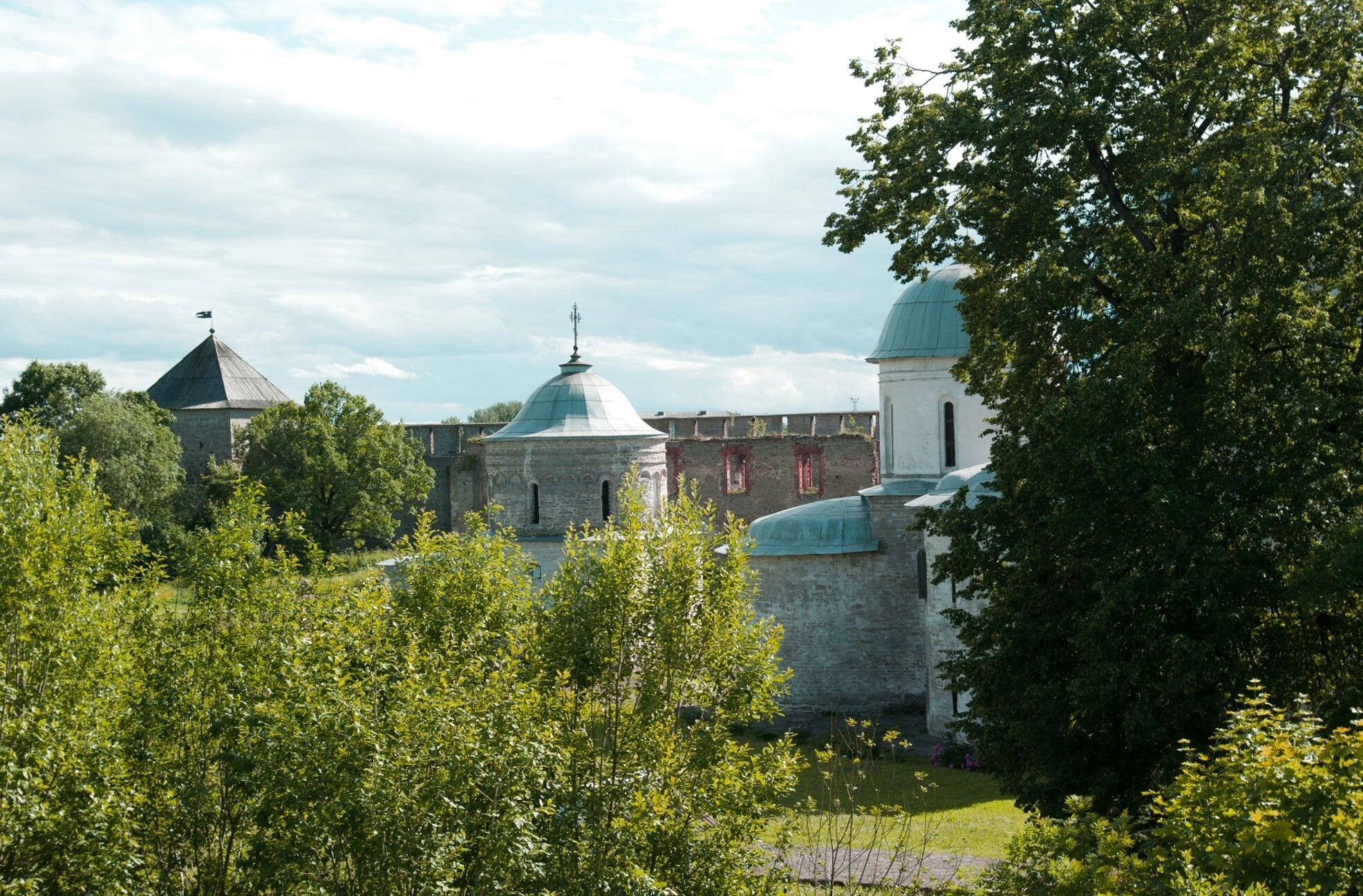 На переднем плане фотографии видны мощные каменные стены и башни крепости, выстроенные из местного известняка. Эти неприступные укрепления неоднократно выдерживали осады вражеских войск, охраняя святыни православные и русскую государственность. Живописный природный ландшафт с пышной зеленью деревьев подчёркивает гармонию божественного творения и человеческого труда, освящённого верой Христовой.