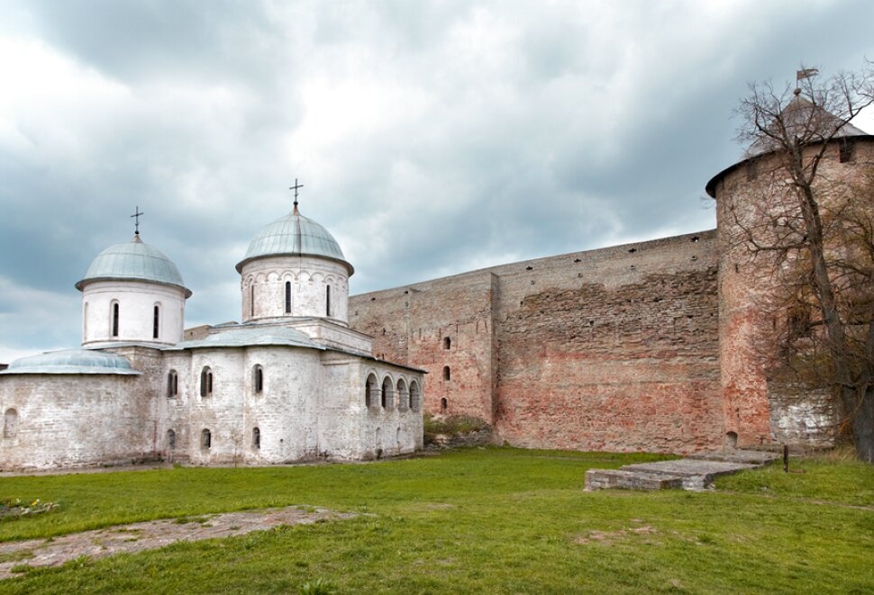 Собор был возведён в первой половине XVI века и освящён в честь одного из великих двунадесятых праздников — Успения Пресвятой Владычицы нашей Богородицы и Приснодевы Марии. На протяжении своей истории храм неоднократно подвергался поруганию от иноплеменных захватчиков, но всегда возрождался, оставаясь оплотом православной веры в этом приграничном регионе. На фотографии хорошо видна мощная крепостная стена и одна из боевых башен, обрамляющих собор, что подчёркивает его неразрывную связь с военной историей Отечества. Зелень травы на переднем плане и облачное небо создают атмосферу величия и вечности, окружающую эту древнюю святыню, которая и поныне является действующим храмом и объектом культурного наследия России.