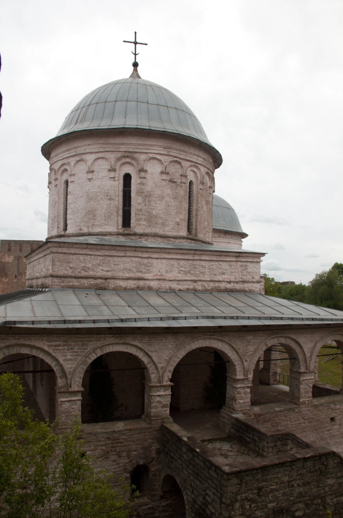 На представленной фотографии запечатлён Успенский собор — православный храм в честь Успения Пресвятой Богородицы, являющийся неотъемлемой частью ансамбля Ивангородской крепости. Собор расположен на высоком берегу реки Нарвы, в непосредственной близости от границы с Эстонией, что подчёркивает его историческое значение как духовного форпоста православия на северо-западе Руси.