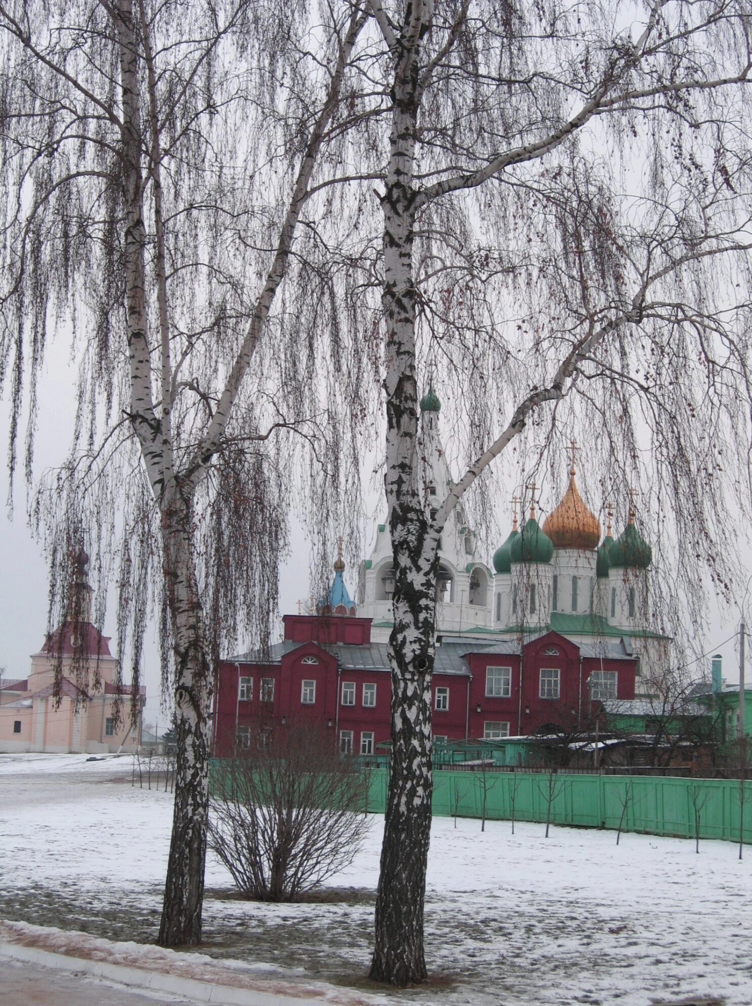 На переднем плане фотографии видны два дерева с ажурными ветвями, создающими естественное обрамление для архитектурной композиции. Земля и кровли построек покрыты снежным покровом, свидетельствующим о зимнем времени года.