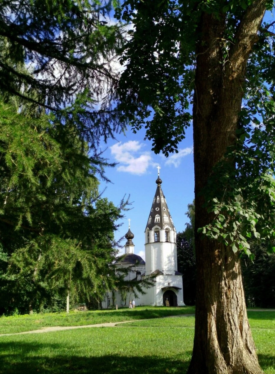 Окружающий храм природный ландшафт с могучими деревьями и ухоженной территорией создает особую духовную ауру, присущую древним православным святыням. Фотография передает не только архитектурные особенности храма, но и его глубокое духовное содержание как дома молитвы и православной веры.