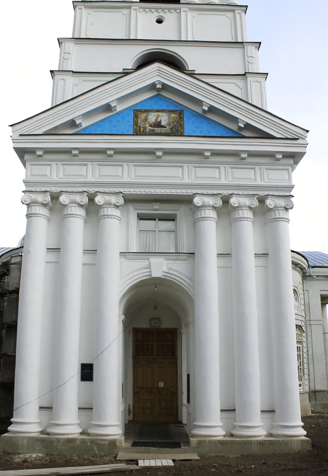 На представленной фотографии запечатлён первый ярус колокольни Собора Успения Пресвятой Богородицы, что в древнем городе Рыльске Курской области. Этот величественный храм является выдающимся памятником церковной архитектуры второй половины XVIII века и одной из главных духовных доминант города.