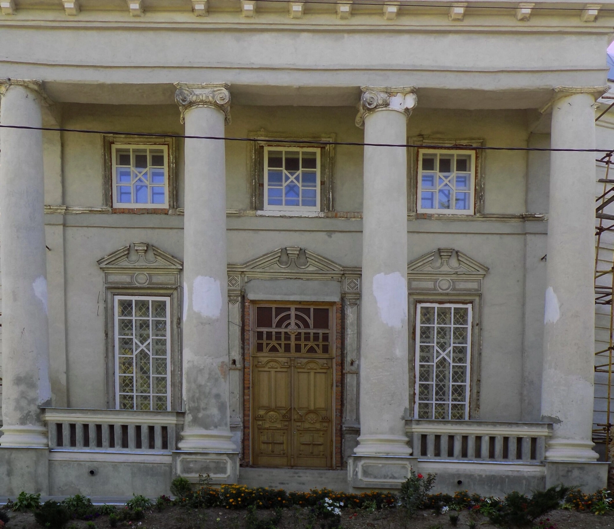 Центральным элементом композиции выступает монументальный портик, поддерживаемый четырьмя мощными колоннами дорического ордера, которые воплощают в себе величие и духовную твердыню. Колонны несут на себе строгий антаблемент, завершающийся треугольным фронтоном, что характерно для канонов классической храмовой архитектуры.