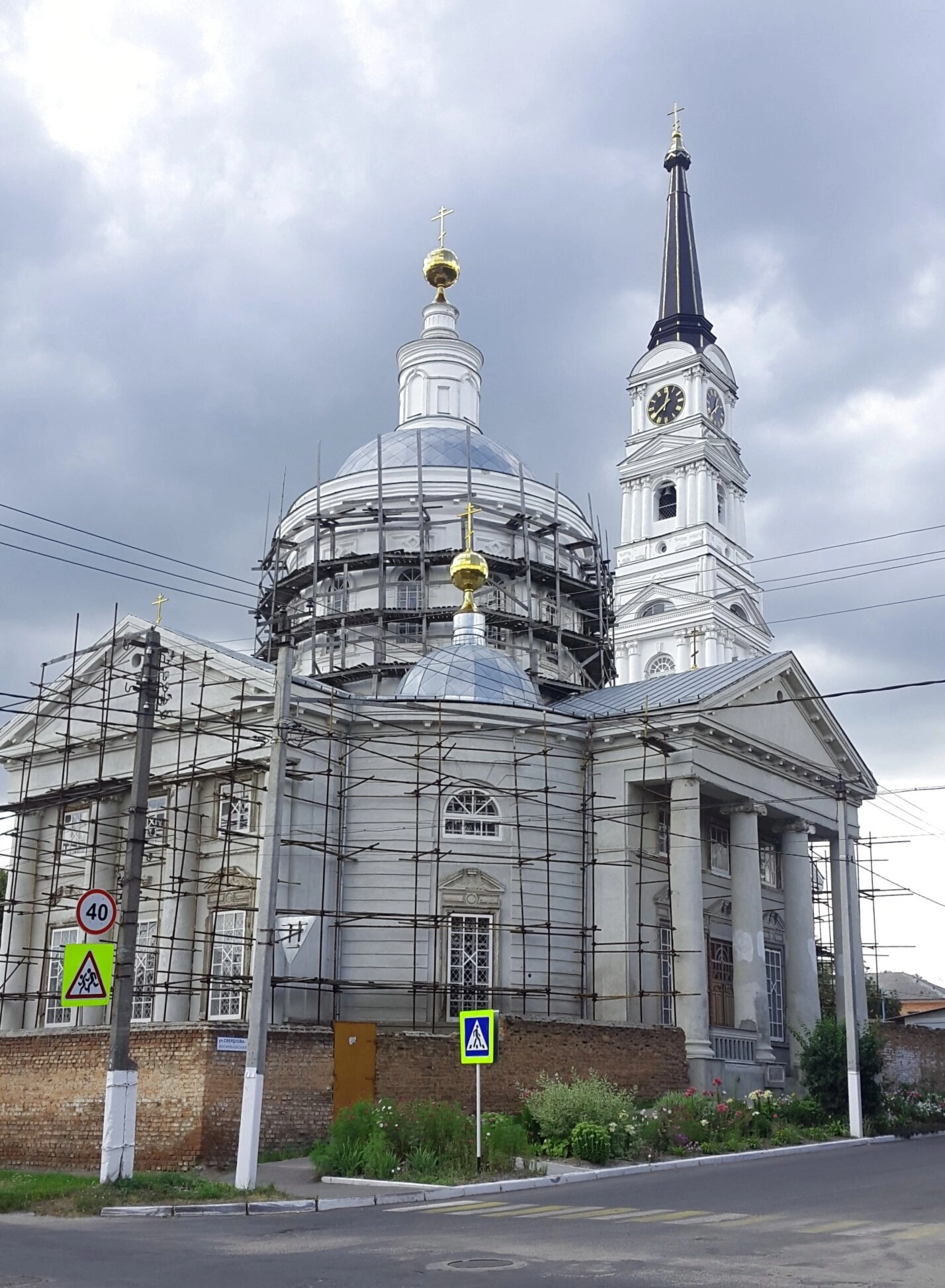 Собор был возведён в 1811 году на средства рыльского купечества и является ярким образцом классицизма в русском храмовом зодчестве. Его монументальный объём, увенчанный пятиглавием, традиционно символизирует Господа нашего Иисуса Христа в окружении четырёх евангелистов. Несмотря на временные строительные конструкции, чётко читаются строгие линии фасадов, арочные оконные проёмы и благородные пропорции всего сооружения.
