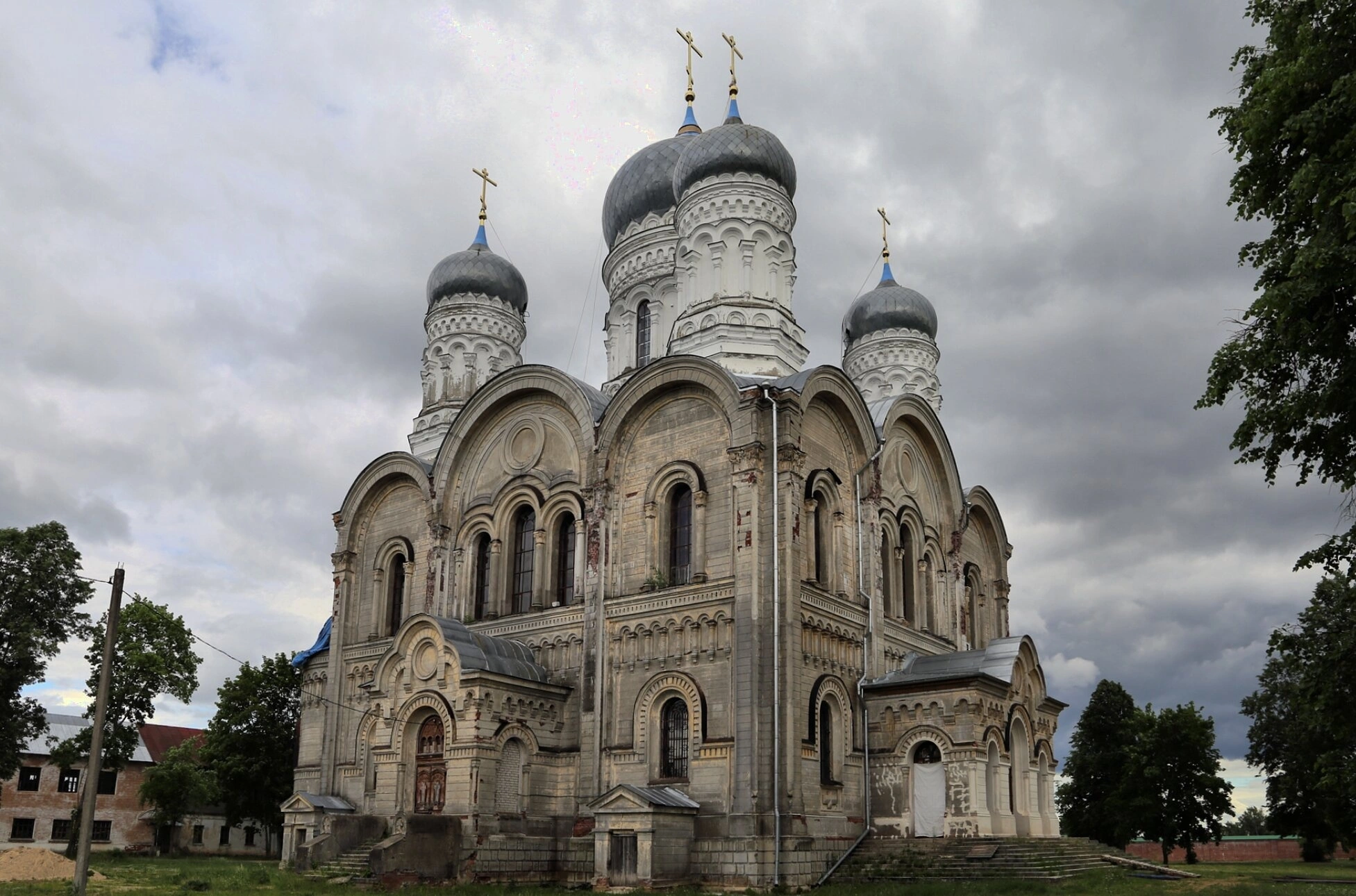 Фотография позволяет созерцать архитектурную гармонию и спокойное величие храма. Собор стоит на открытой зелёной лужайке, окружённый деревьями, под просторным небом. Его светлые стены, украшенные аркатурными поясами и арочными оконными проёмами, несут отпечаток строгой благодати. Отсутствие людей на переднем плане позволяет сосредоточить внимание на святыне, ощутить её как духовный маяк, призывающий к молитве и уединённому размышлению. Этот образ напоминает о вечности и непреходящей красоте дома Божия, пережившего земные бури и вновь возносящего молитву к небесам.