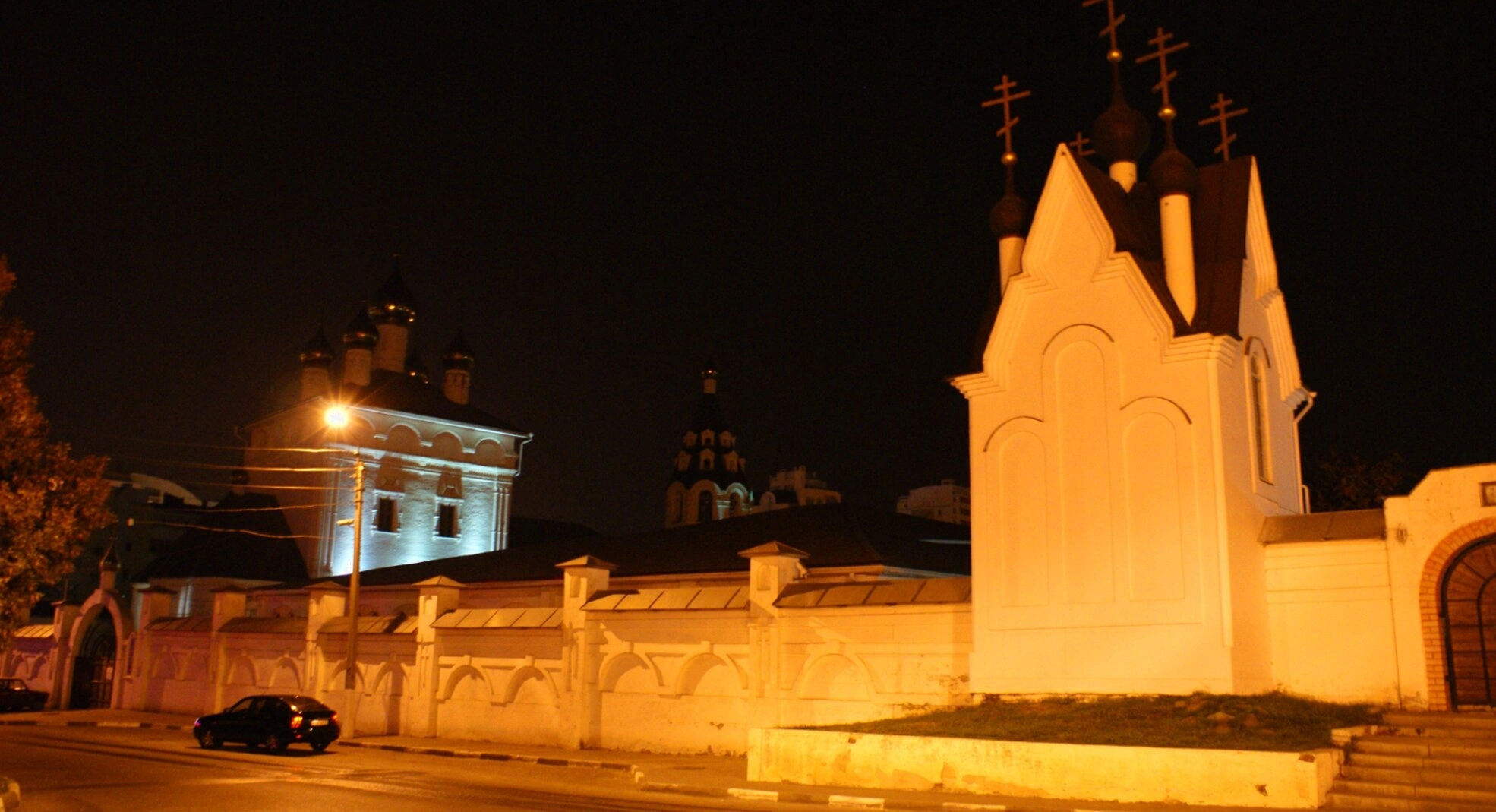 На представленной фотографии запечатлен Успенско-Николаевский собор, величественно возвышающийся в ночной тишине Белгорода. Его белоснежные стены, ярко освещенные искусственным светом, создают благостный образ, контрастирующий с темным фоном ночного неба. Пять куполов, увенчанных святыми крестами, символизируют Христа и четырех евангелистов, устремляя молитву к небесам. Собор, обнесенный невысокой оградой, представляет собой целостный архитектурный ансамбль, включающий и другие строения с куполами на заднем плане, принадлежащие Марфо-Мариинскому женскому монастырю.