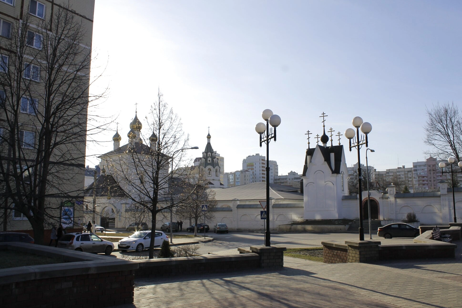 Фотография сделана в ясный солнечный день, когда небесная лазурь подчёркивает благолепие святой обители. Чётко просматриваются тени от деревьев и фонарных столбов, что свидетельствует о высоте солнца над горизонтом. На переднем плане видны элементы городской инфраструктуры, а на заднем плане просматриваются современные жилые здания, что создаёт интересный контраст между духовным и мирским.
