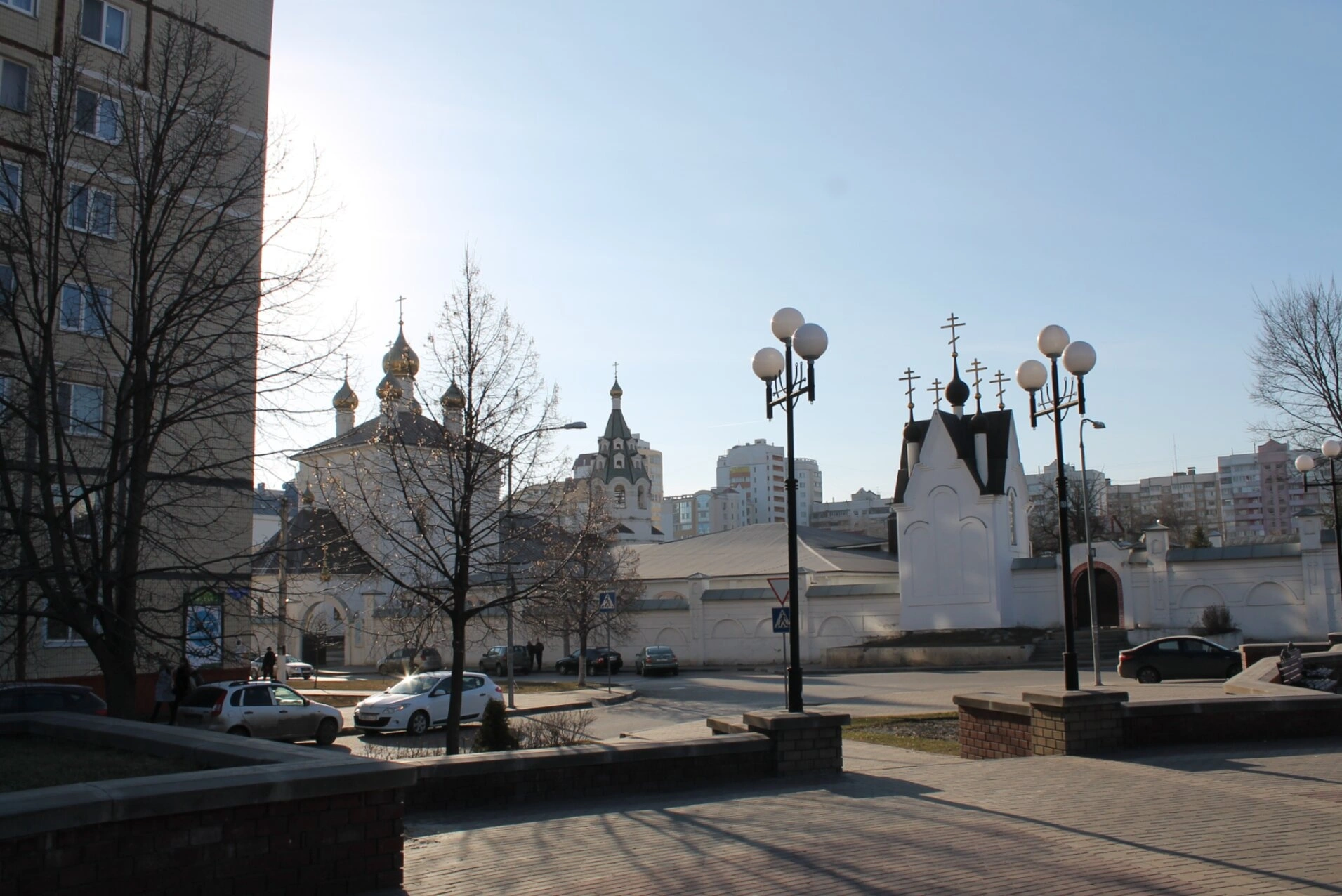 Территория вокруг собора благоустроена и обнесена белой оградой. На переднем плане видны фонарные столбы, отбрасывающие чёткие тени на мощёное покрытие, что свидетельствует о ясной солнечной погоде в день съёмки. Деревья, лишённые листвы, указывают на холодное время года — позднюю осень или раннюю весну. На заднем плане просматриваются современные городские постройки и жилые дома, что подчёркивает гармоничное сочетание древней святыни и динамично развивающегося городского пространства.
