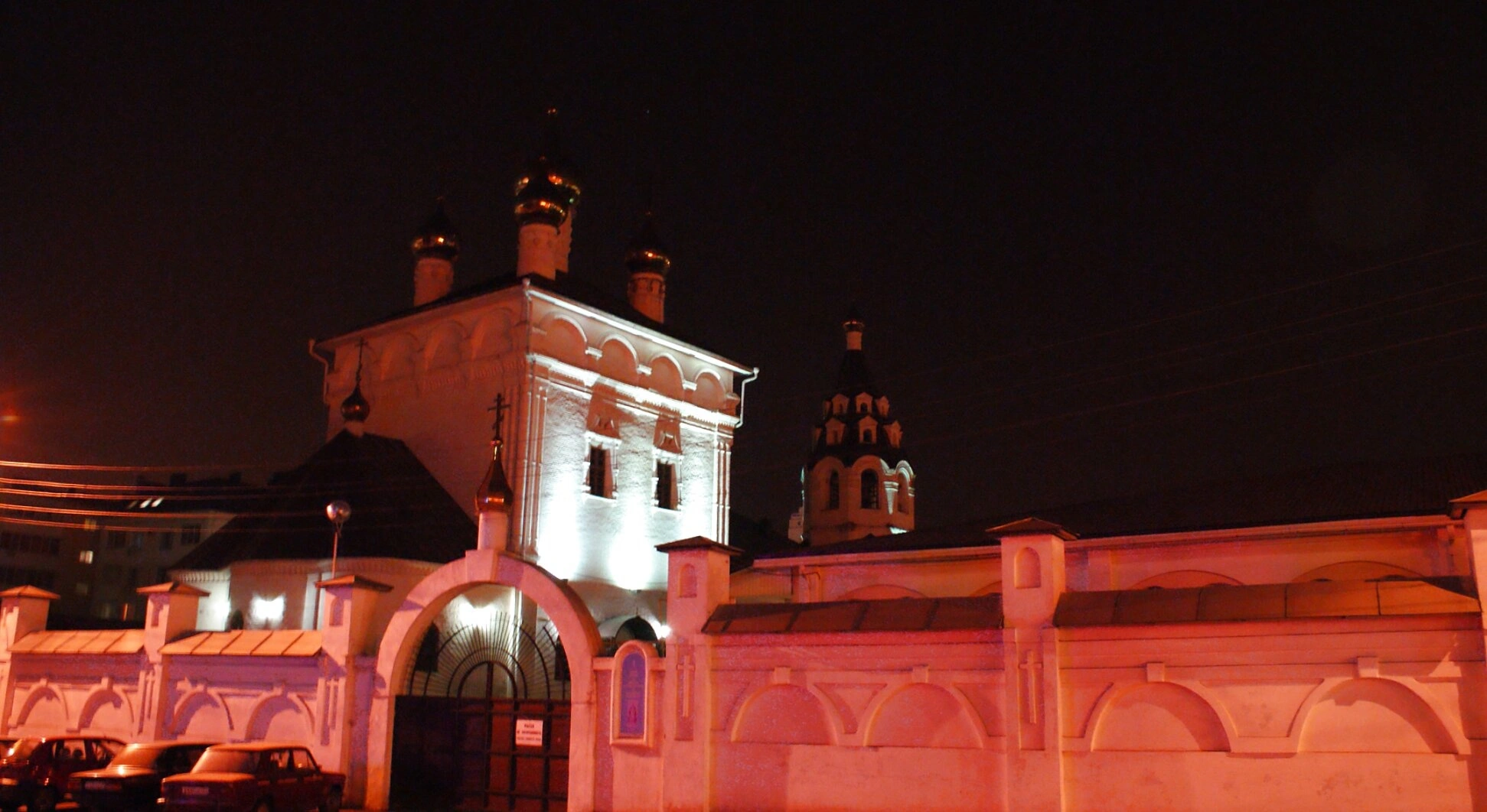 На заднем плане, утопая в тёмном небе, угадывается силуэт ещё одной высокой храмовой постройки, возможно, колокольни. На переднем плане видны припаркованные автомобили, что напоминает о том, что монастырь, несмотря на свою древнюю историю, является живым центром духовной жизни современного города.