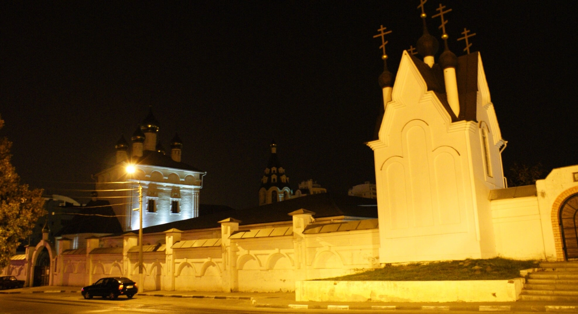 Чётко видны светлые стены храма, увенчанные традиционными для православного зодчества луковичными главами с золочёными крестами, сияющими во тьме. Композиция фотографии позволяет рассмотреть элементы отделки фасада и ощутить мирную и умиротворённую атмосферу, окружающую святую обитель после захода солнца.