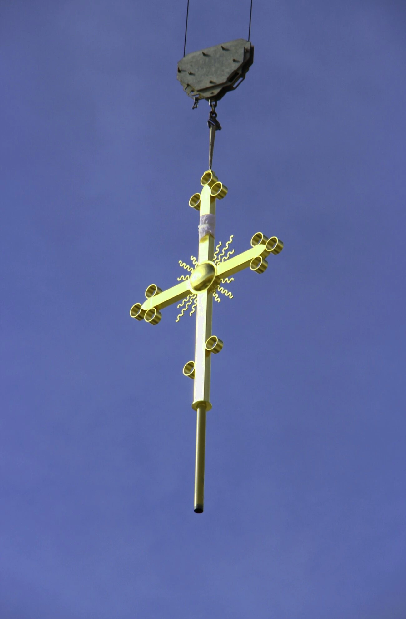 На представленной фотографии запечатлён ключевой момент в освящении любого православного храма — установка накупольного креста. Массивный позолоченный крест, подвешенный на стальных тросах, медленно и торжественно поднимается к вершине центрального купола собора Святой Равноапостольной Марии Магдалины в Мадриде.