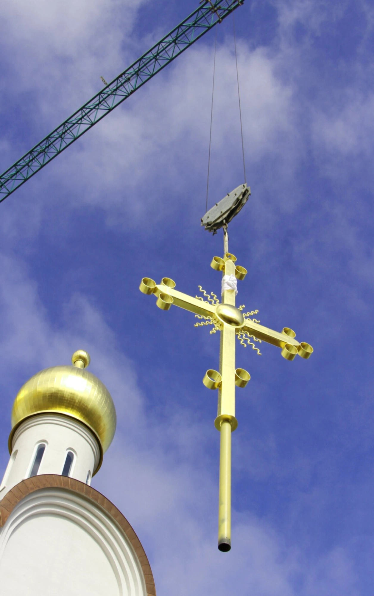 Величественный крест, украшенный традиционными декоративными элементами, бережно поднимается строительным краном на фоне чистого голубого неба. В левой части кадра видна сияющая золотом главка храма, на которую и водружают этот символ спасения и искупления. Процессия установки креста является завершающим и наиболее значимым этапом в освящении любого православного храма, обозначая его предназначение как Дома Божия.