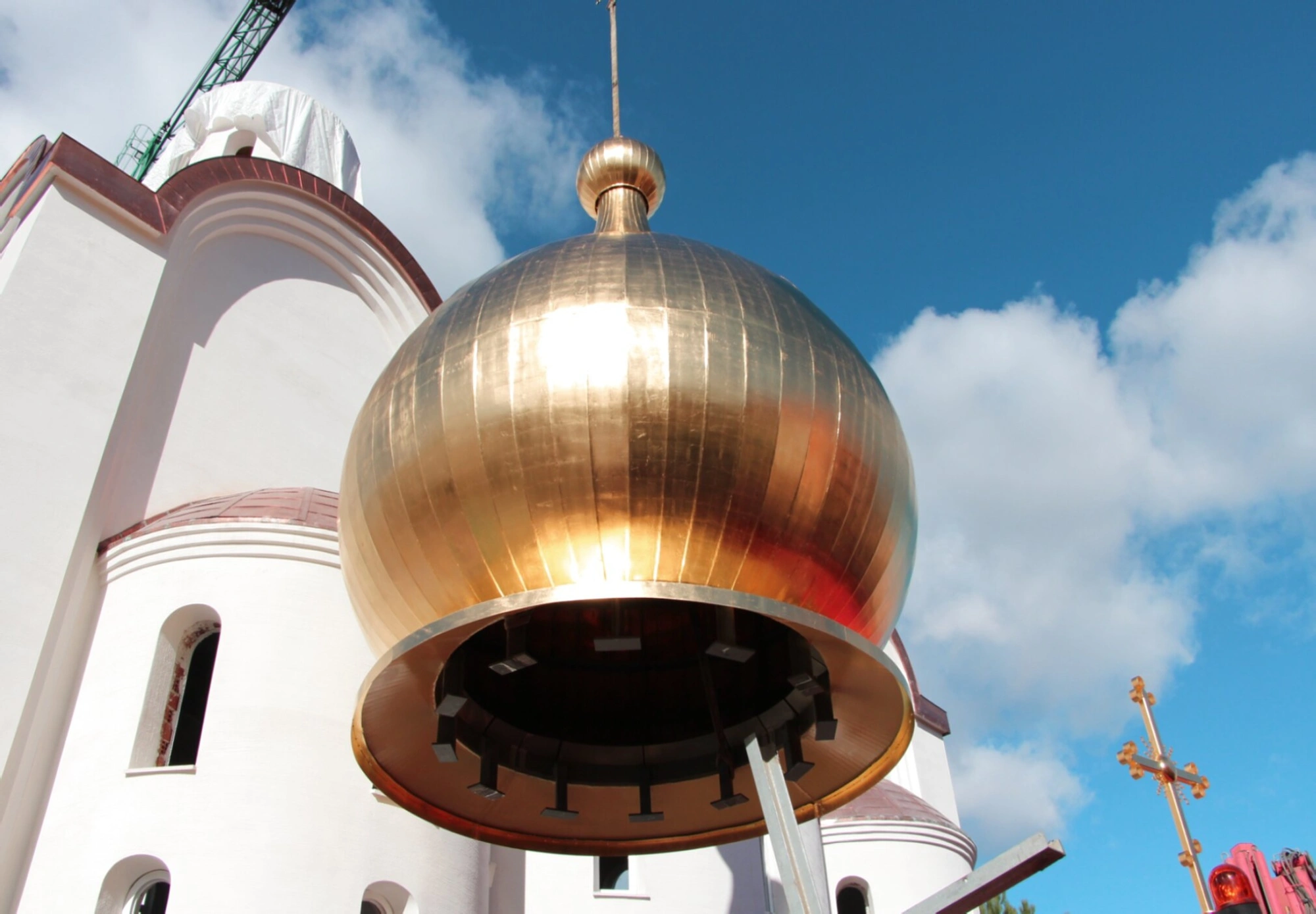 Величественный купол, сияющий на фоне безмятежного голубого неба с легкими облаками, воплощает в себе традиции русского церковного зодчества. Его характерная форма, увенчанная православным крестом, символизирует пламя свечи, устремляющееся к небесам. В нижней части купола и на фоне здания видны элементы строительных лесов и подъемного оборудования, что указывает на ведение реставрационных работ или завершающий этап строительства.