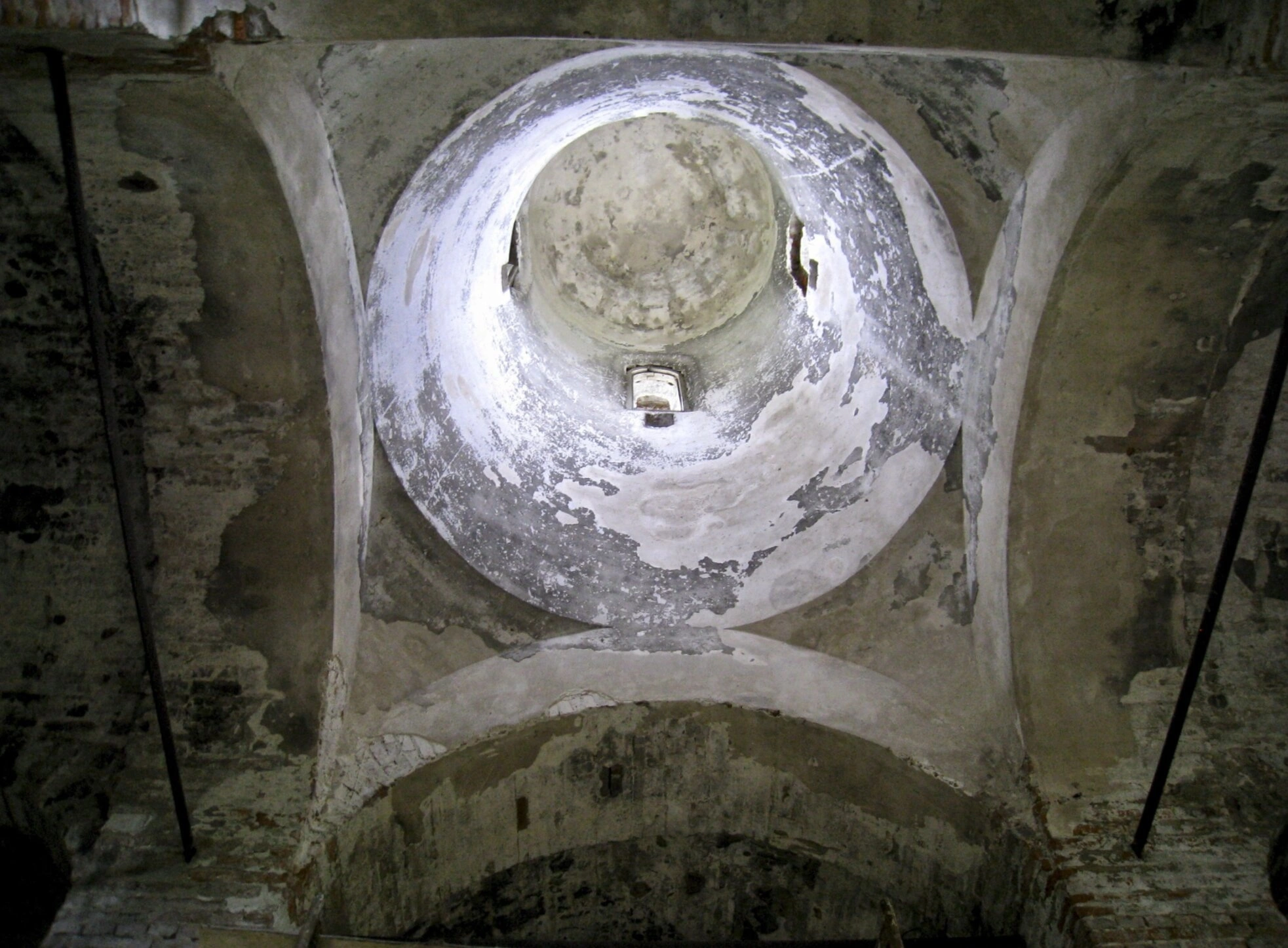 Центральным элементом композиции является величественное круглое отверстие в куполе, через которое обильно проникает божественный свет, символизирующий связь земного мира с горним. Этот световой проём обрамлён массивными кирпичными сводами, создающими особую атмосферу благоговения и вечности. По периметру купола видны следы времени в виде облупившейся штукатурки и потемневших от влаги участков, что придаёт пространству глубокий исторический характер.