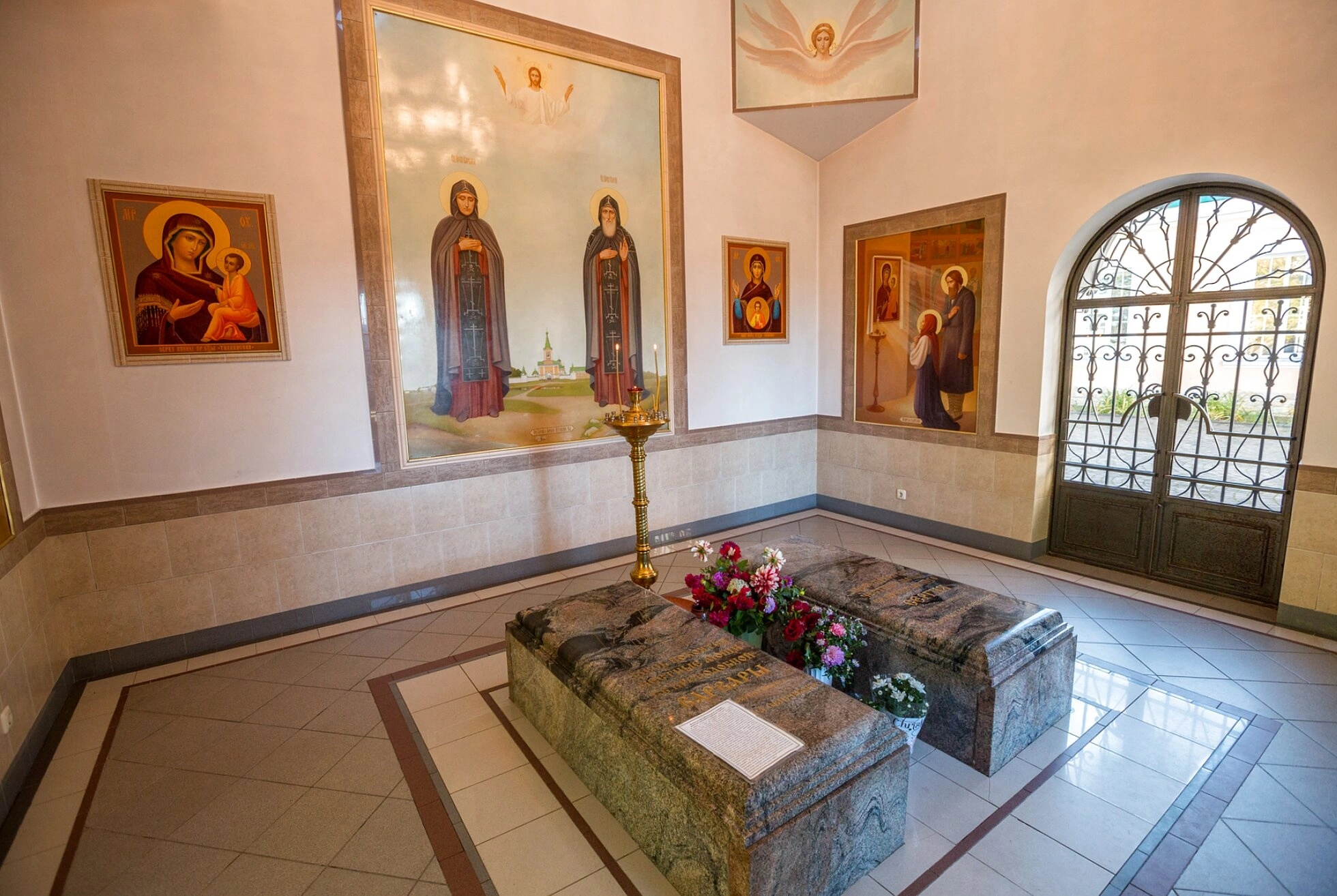 В центре композиции снимка возлежат сами гробницы с честными мощами праведных супругов. Они являются главной духовной святыней монастыря, привлекающей множество паломников, ищущих молитвенного предстательства святых угодников. Надгробия украшены с благоговением и любовью, что отражает глубокое почитание их памяти в православном народе.