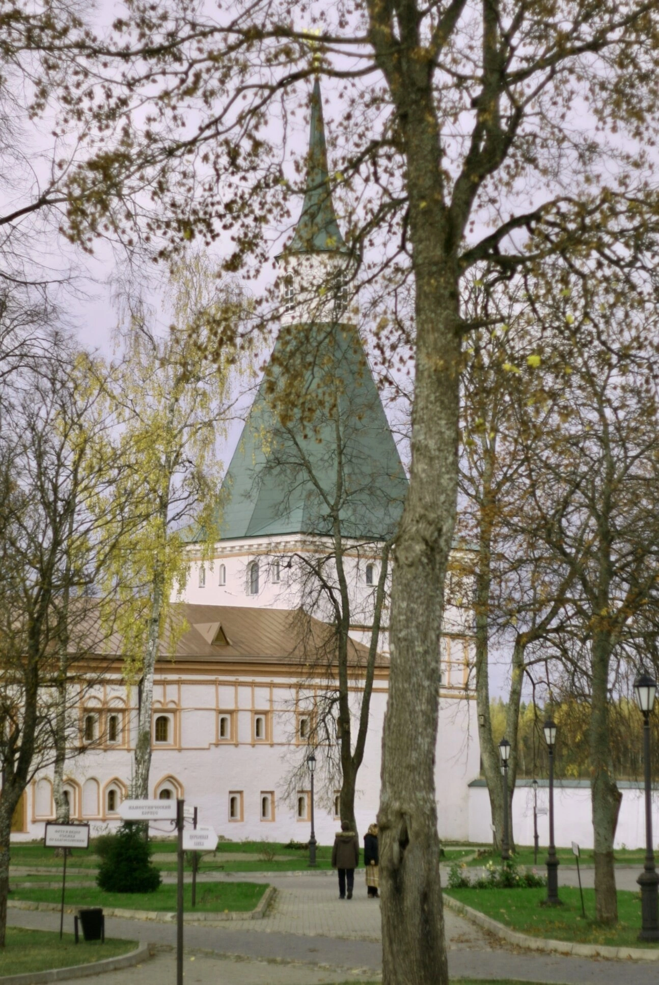 Территория вокруг обители ухожена и благоустроена. Осенняя листва деревьев, окрашенная в золотистые и багряные тона, подчёркивает умиротворённость и спокойствие этого святого места. Две фигуры людей, прогуливающихся по аллее, помогают оценить величественность масштабов построек. Вся композиция фотографии передаёт атмосферу мира, молитвенного сосредоточения и глубокой исторической памяти, которую хранит в себе Валдайская обитель.