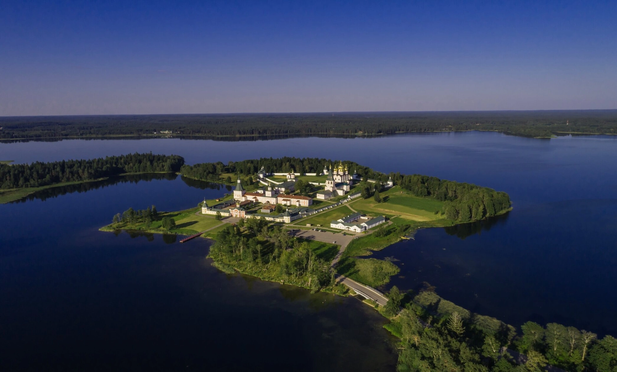 Водная гладь озера, отражающая небесную лазурь, и окружающие монастырь хвойные леса создают ощущение уединённости, благодати и покоя, присущее этому святому месту. Основанная по повелению Святейшего Патриарха Никона в XVII веке, обитель была воздвигнута для хранения главной своей святыни — Иверской иконы Божией Матери. Данный ракурс подчёркивает неразрывную связь творения рук человеческих, вдохновлённого Божественным промыслом, и нетронутой красоты северной природы.