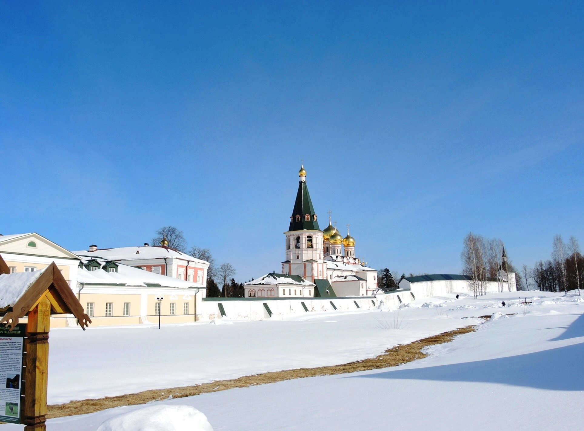 На фотографии также видны стройная шатровая колокольня, надвратная церковь во имя святителя Филиппа, митрополита Московского, и каменные стены с башнями, придающие монастырю вид неприступной крепости духа. Белоснежный покров подчёркивает благолепие синих с золотыми звёздами глав и тёплый цвет кирпичных стен, создавая образ небесного града Иерусалима, сошедшего на землю. Этот зимний пейзаж отражает особую духовную атмосферу уединённой монашеской жизни, строгости и молитвенного подвига, совершаемого в стенах обители на протяжении более трёх с половиной столетий.