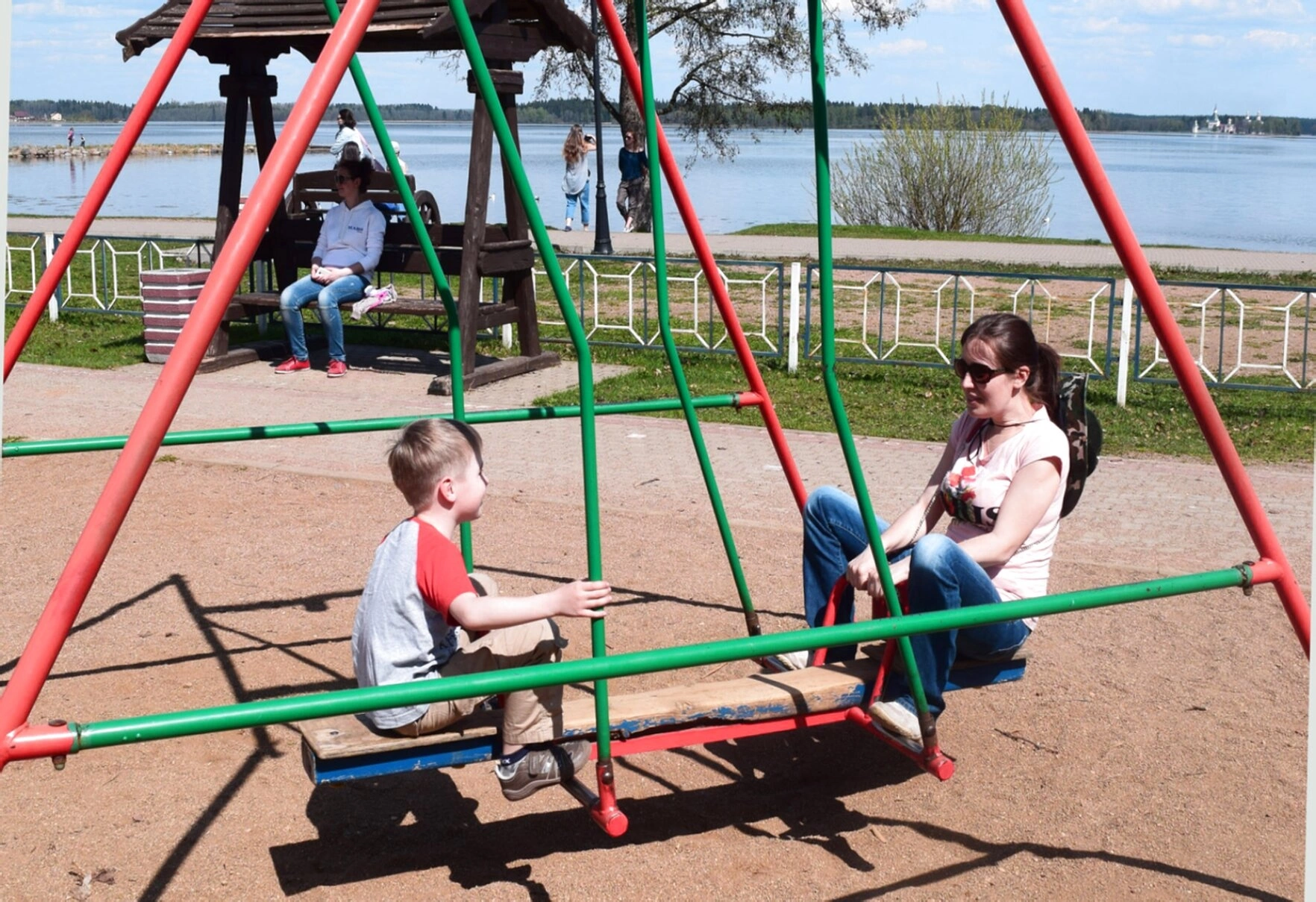 На представленной фотографии запечатлена мирная сцена на детской площадке, расположенной на территории Валдайского Иверского Богородицкого Святоозерского монастыря. На переднем плане мать с ребёнком мирно беседуют, сидя на качелях, что символизирует тихую радость семейной жизни, оберегаемой стенами святой обители. Их взгляды, устремлённые друг на друга, наполнены спокойствием и умиротворением, которые дарует это намоленное место.
