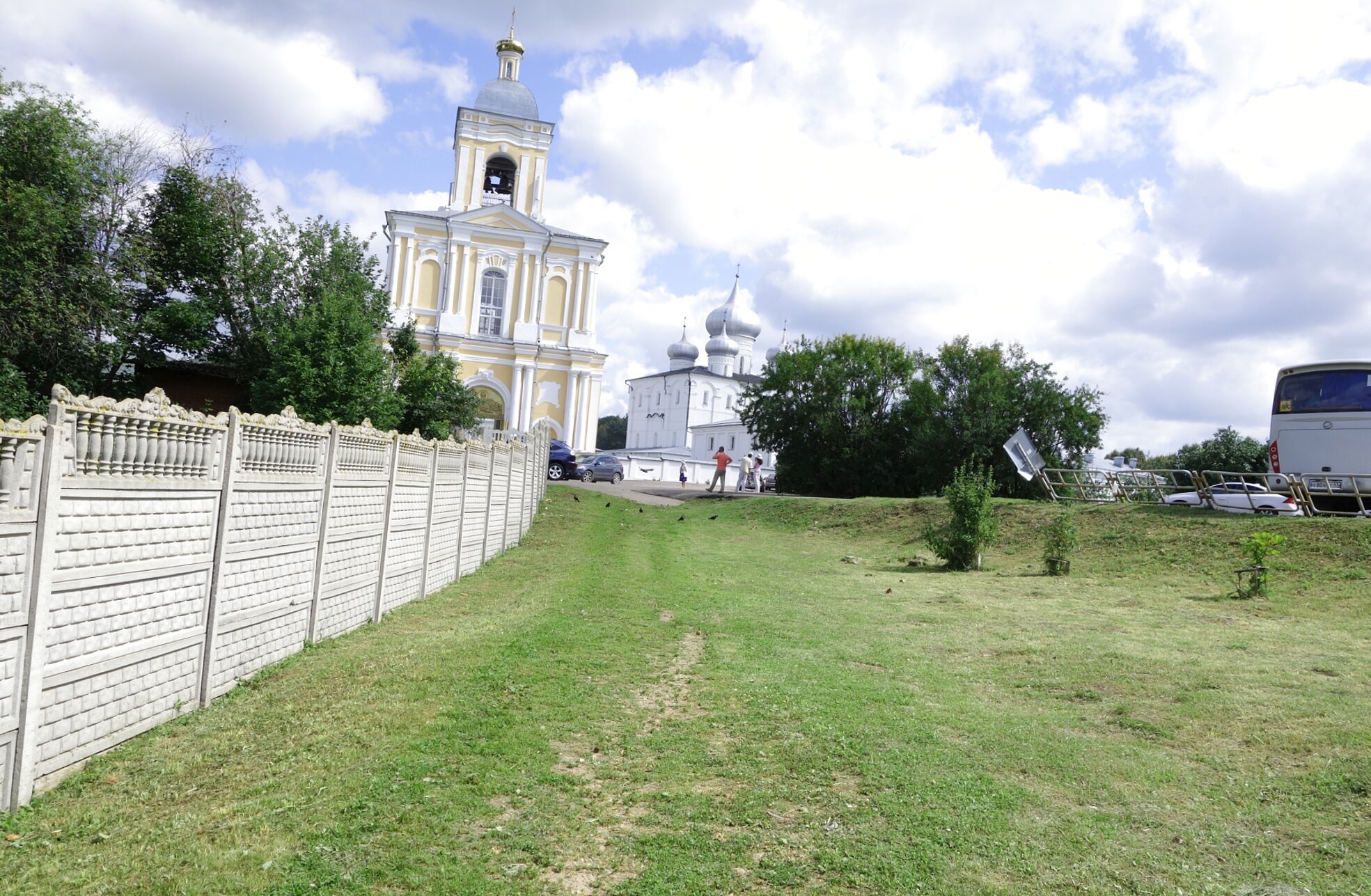 Территория монастыря, видимая на фотографии, ухожена и благоустроена. Зелёные лужайки, деревья и ограда создают атмосферу умиротворения и покоя. Наличие припаркованных автомобилей и автобуса свидетельствует о том, что древняя обитель остаётся действующим монастырём и популярным местом паломничества для верующих, стремящихся прикоснуться к великой истории русского православия и помолиться у святых мощей угодника Божия.