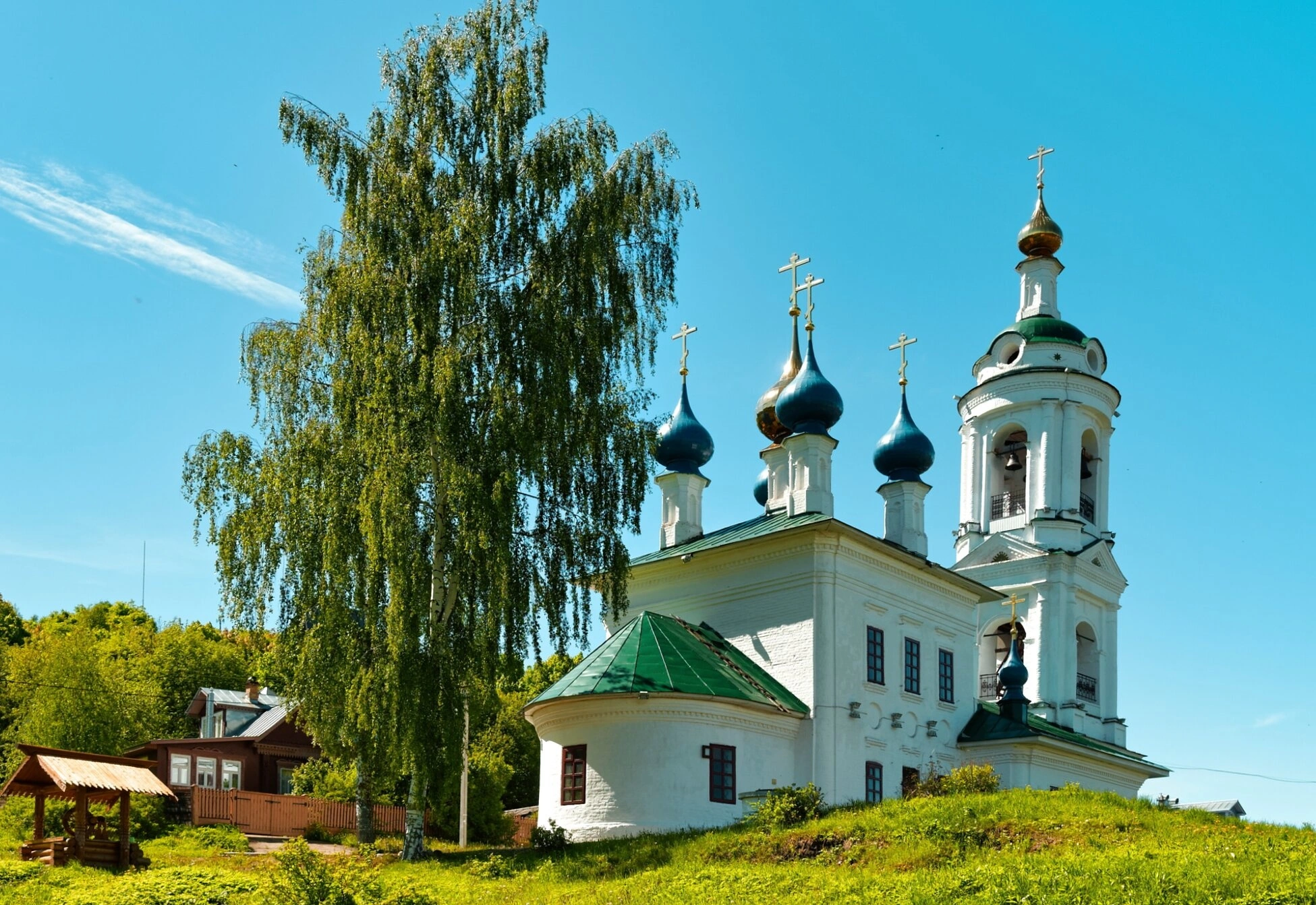 На фотографии запечатлена Варваринская церковь, расположенная в живописном городе Плёс на Волге. Этот православный храм, освящённый во имя святой великомученицы Варвары, является одним из архитектурных символов города и важной духовной достопримечательностью Ивановской области.