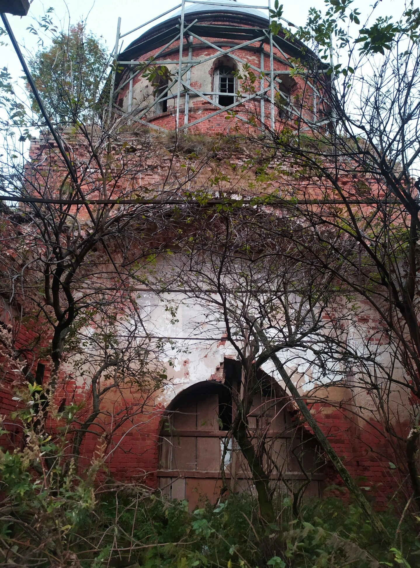 Архитектурный облик церкви демонстрирует характерные черты русского храмового зодчества. На снимке хорошо просматривается состояние здания: местами обветшавшая штукатурка обнажает кирпичную кладку, часть оконных проёмов временно заколочена. Несмотря на признаки восстановительных работ, храм сохраняет своё духовное величие и архитектурную целостность.