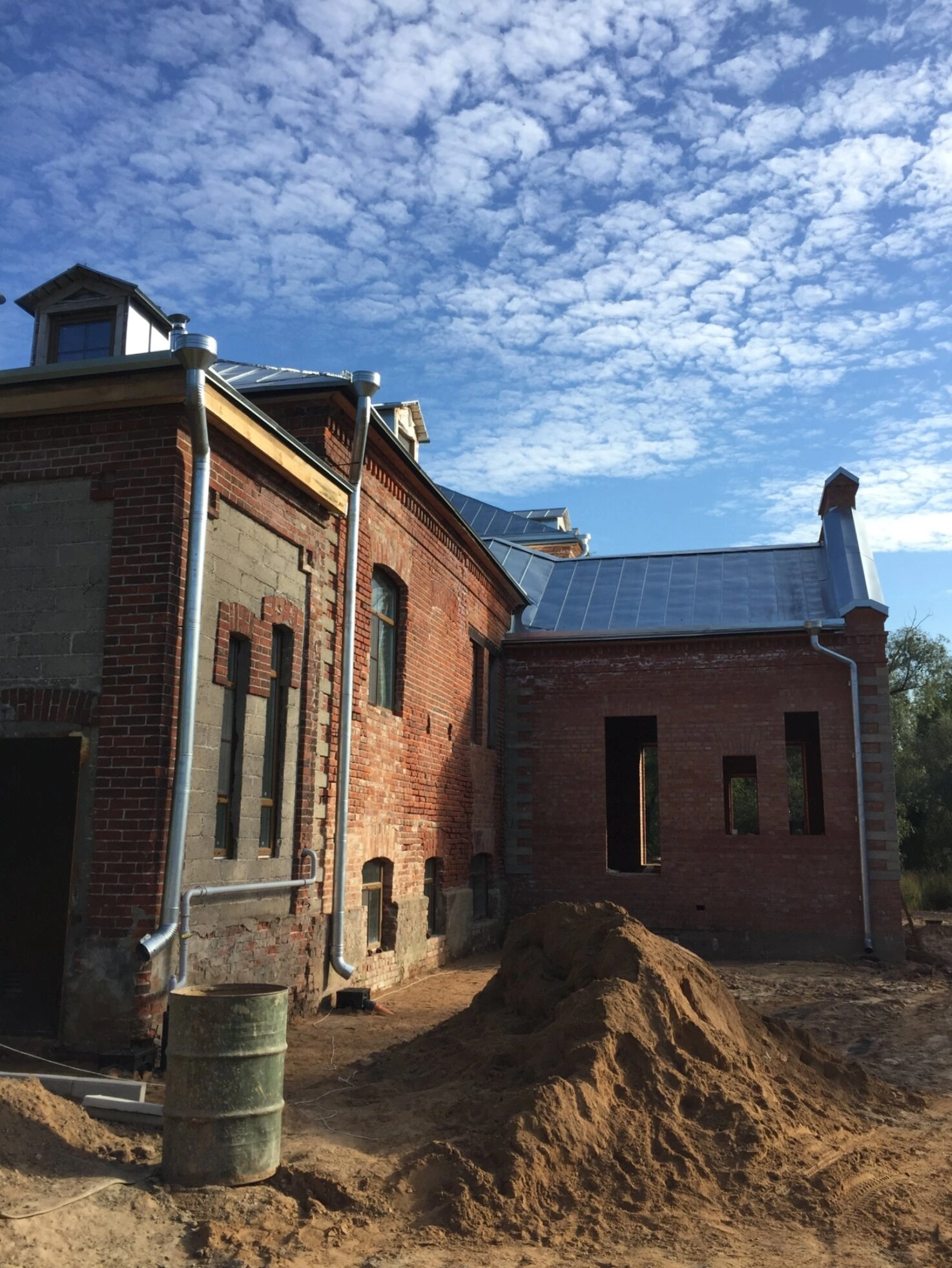 Небесный свод над восстанавливаемой церковью изображён ясным, с обильными кучевыми облаками, что создаёт светлую и hopeful атмосферу вокруг возрождающегося дома Божьего. Отсутствие строительной техники и рабочих на снимке позволяет сосредоточить внимание на архитектурных особенностях храма и масштабе проводимых восстановительных работ.