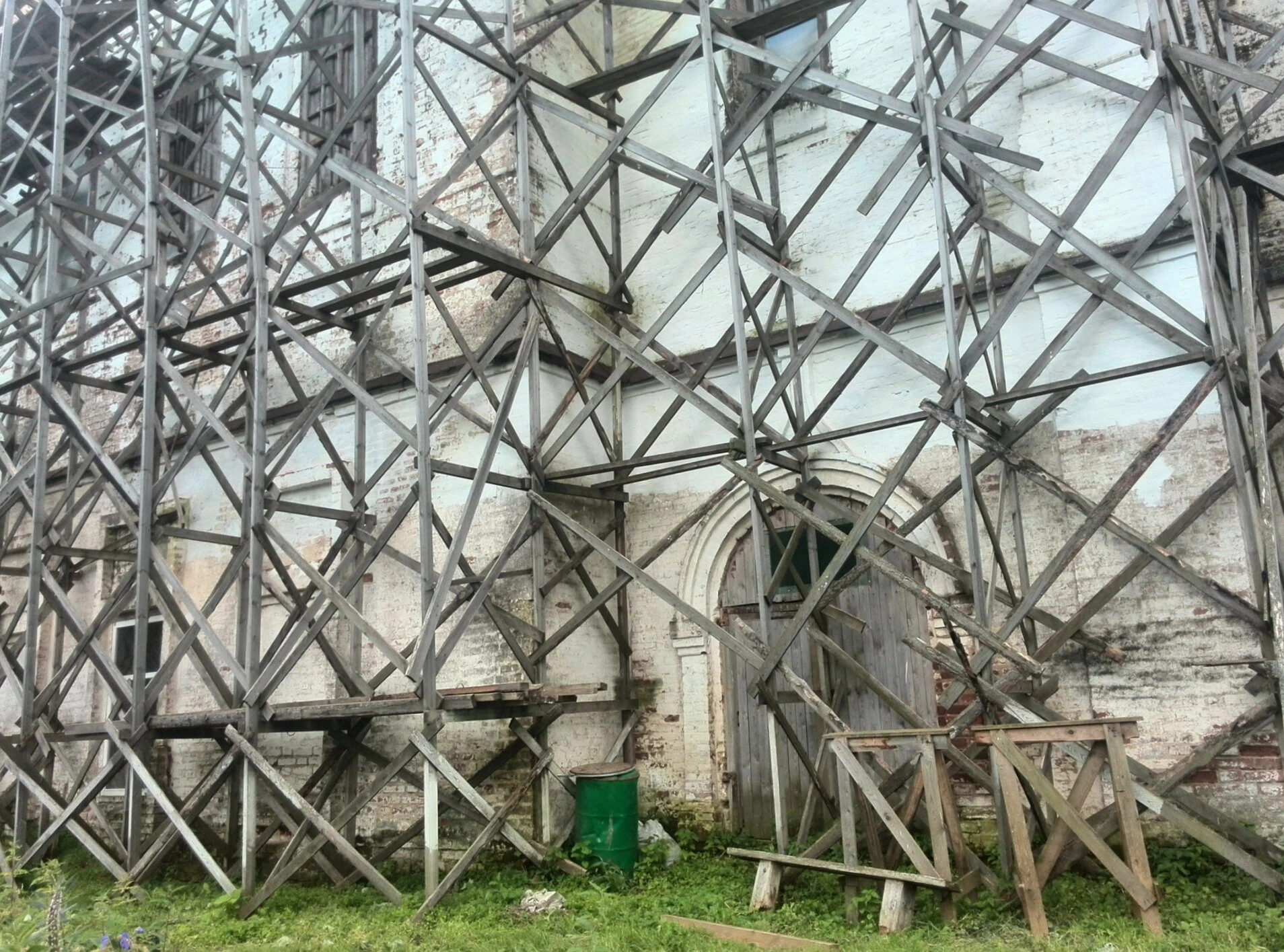 Несмотря на то что леса скрывают значительную часть архитектурного облика, в правой части снимка угадывается арочное обрамление входа и массивная деревянная дверь, ведущая в молитвенное пространство. Стены храма, сложенные из светлого кирпича и частично оштукатуренные, несут на себе отпечаток времени и свидетельствуют о необходимости бережного восстановления.