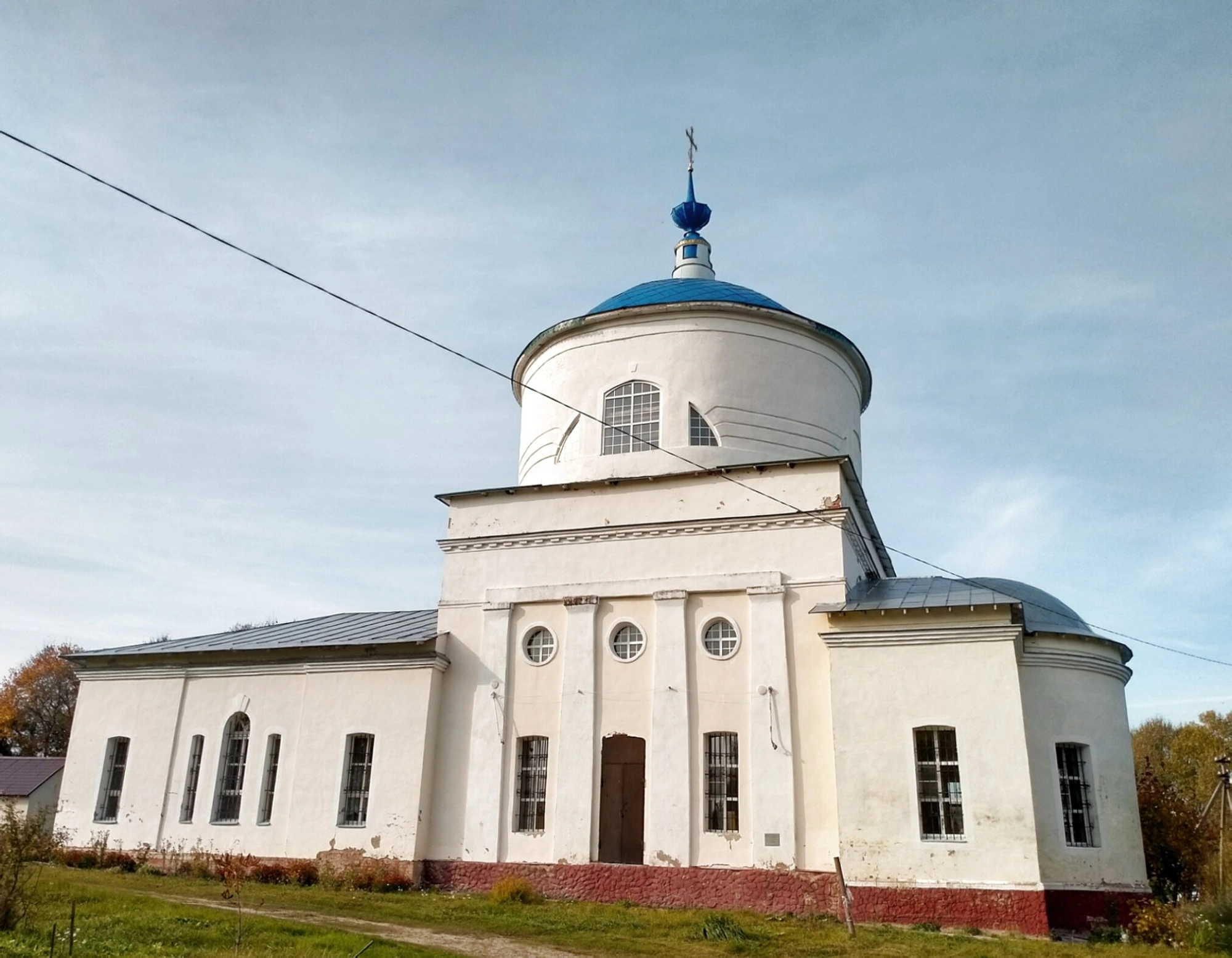 Фотография передаёт атмосферу действующего сельского храма. Кадр сделан в осеннее время: на переднем плане видна грунтовая дорога, по бокам — деревья с жёлтой листвой. Над церковью проходят линии электропередачи. Общий вид свидетельствует о почтенном возрасте здания: заметны облупившаяся штукатурка и потемневшая металлическая кровля, что лишь подчёркивает историческую подлинность памятника. Изображение позволяет оценить скромное величие этой православной святыни, гармонично вписанной в окружающий сельский пейзаж.