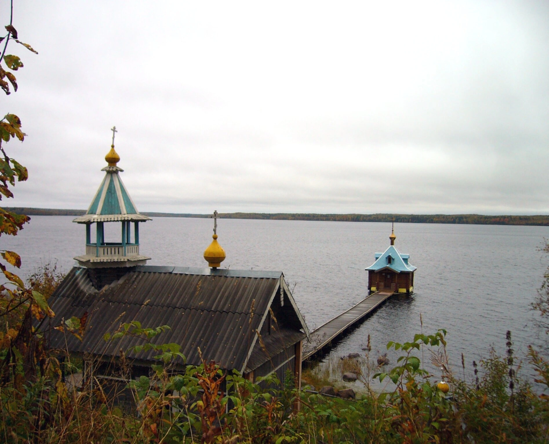 Широкая водная гладь озера, обрамлённая хвойными лесами, подчёркивает суровую красоту карельской природы и удалённость монастыря от мирской суеты, создавая атмосферу молитвенного уединения и покоя. Пасмурная погода на снимке добавляет образу величия и строгости, характерных для северного аскетизма.