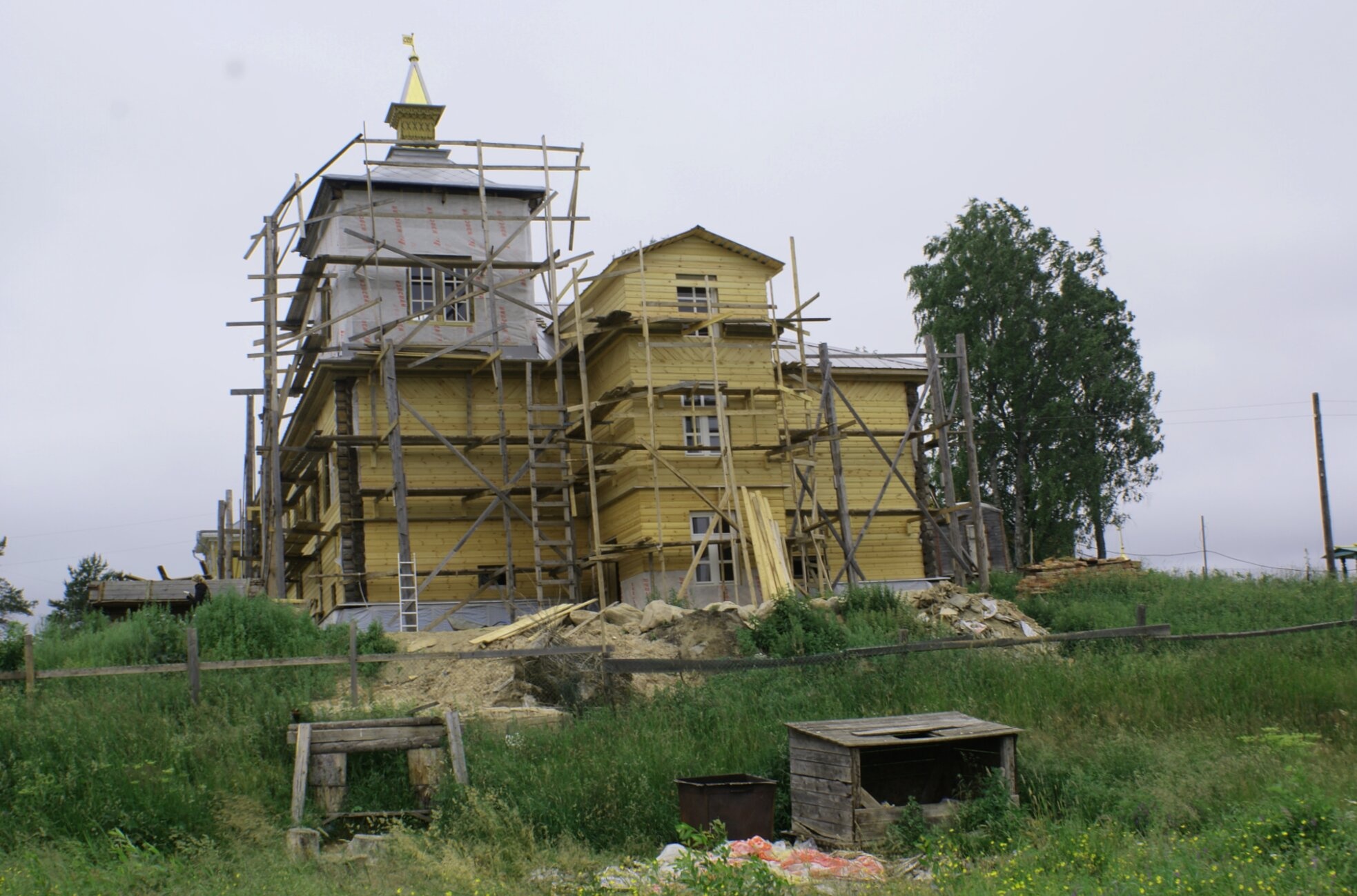 На фотографии запечатлён вид на деревянный храм Важеозерского Спасо-Преображенского мужского монастыря, расположенного в Кондопожском районе Республики Карелия. Святая обитель, основанная в XVI веке преподобными Геннадием и Никифором Важеозерскими, переживает период масштабной реставрации, о чём красноречиво свидетельствуют установленные строительные леса.
