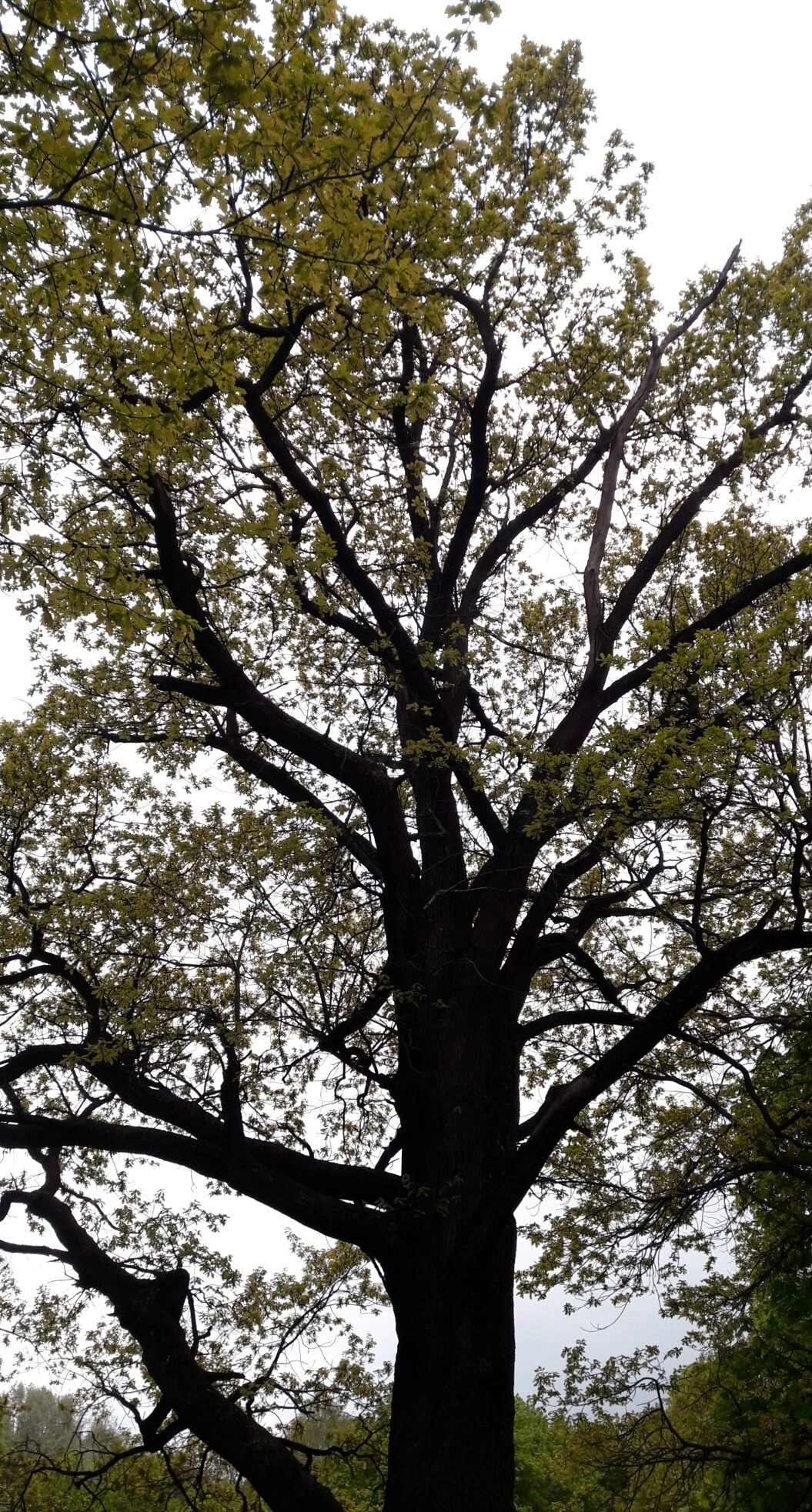На представленной фотографии запечатлён величественный вековой дуб, произрастающий на территории храма Рождества Пресвятой Богородицы в селе Поярково Московской области. Снимок выполнен с нижней точки обзора, что позволяет в полной мере оценить монументальность древнего дерева, чьи мощные, причудливо изогнутые ветви простираются к небесам.