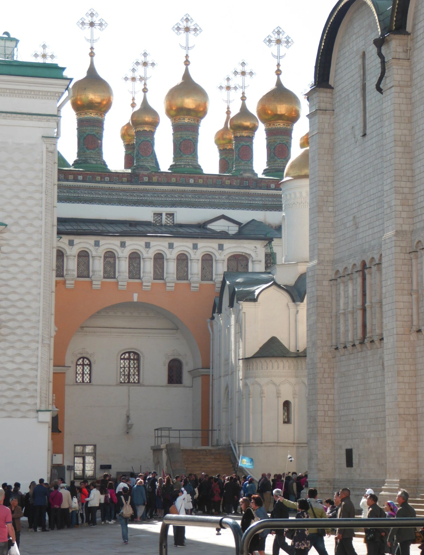 На фотографии, сделанной в Московском Кремле, запечатлён Верхоспасский собор (Собор Спаса Нерукотворного Образа) — домовый храм русских царей, построенный в 1635–1636 годах мастерами Баженом Огурцовым, Антипом Константиновым, Трефилом Шарутиным и Ларионом Ушаковым. Храм входит в комплекс домовых церквей при Теремном дворце и закрыт для свободного посещения. В 1682 году три дворцовые церкви были объединены под общей кровлей, увенчанной одиннадцатью вызолоченными главками, что и сформировало современный облик собора.