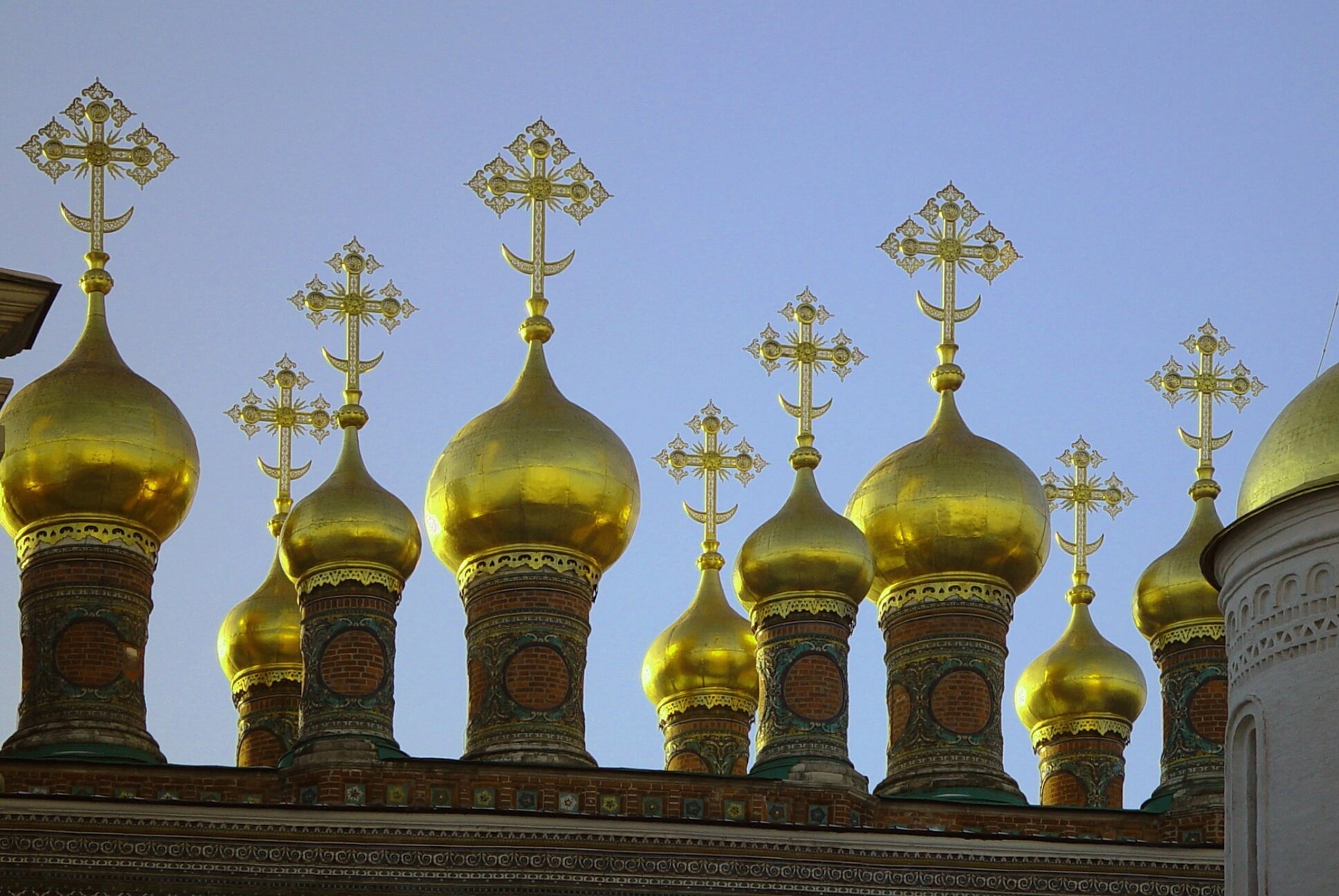 На представленной фотографии запечатлены величественные золотые купола и сияющие кресты Верхоспасского собора, расположенного в самом сердце Московского Кремля. Этот уникальный домовый храм русских государей, освящённый в честь Спаса Нерукотворного Образа, был возведён в 1635–1636 годах над Золотой Царицыной палатой Теремного дворца. Собор входит в комплекс придворных церквей, предназначенных для молитв царской семьи.