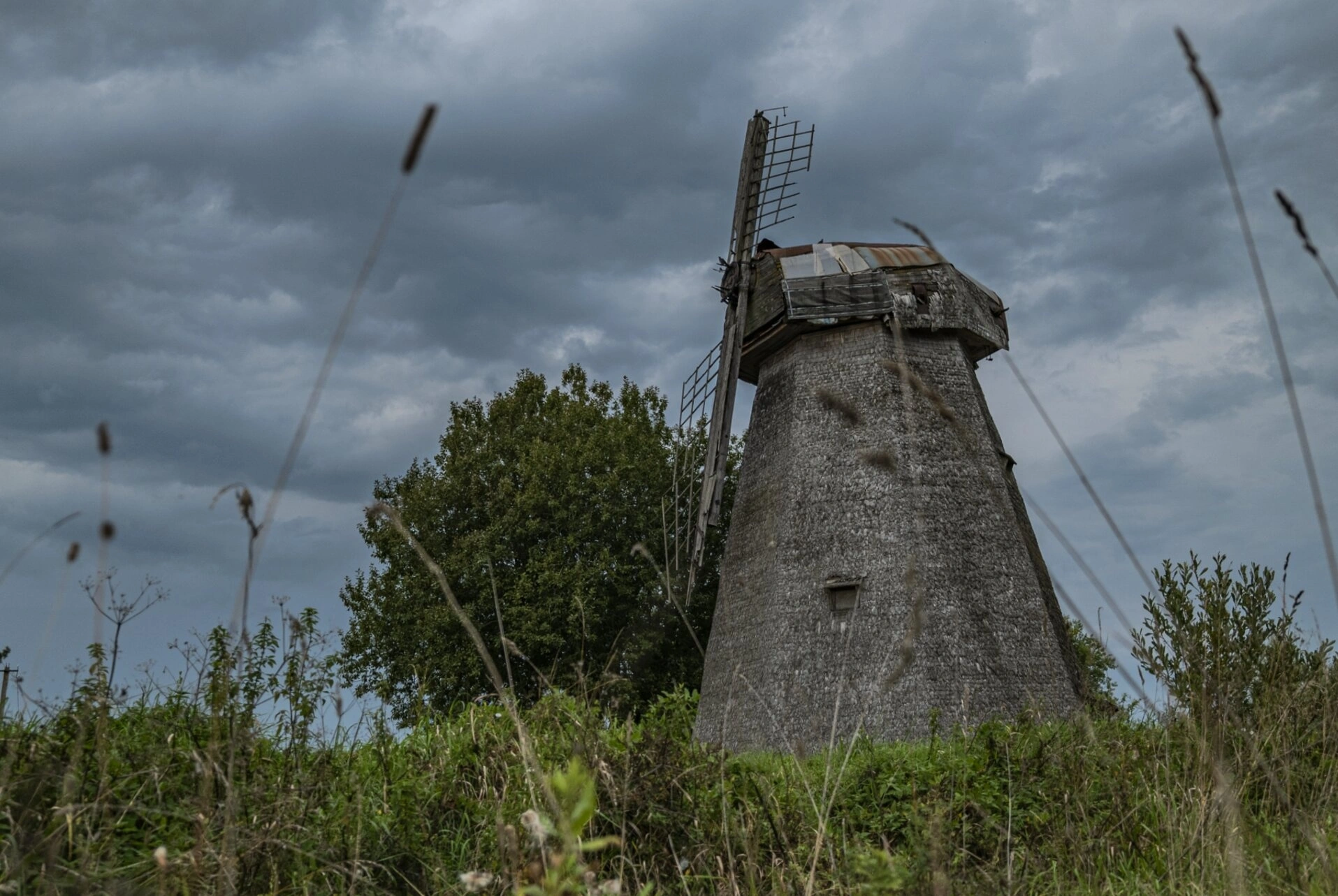 Мельница обладает уникальной округлой формой и обшита традиционной дранкой, что характерно для построек данного региона. На снимке хорошо просматриваются остатки одной из лопастей с деревянной решетчатой рамой, которая в былые времена использовалась для натяжения парусов, приводивших механизм в движение.