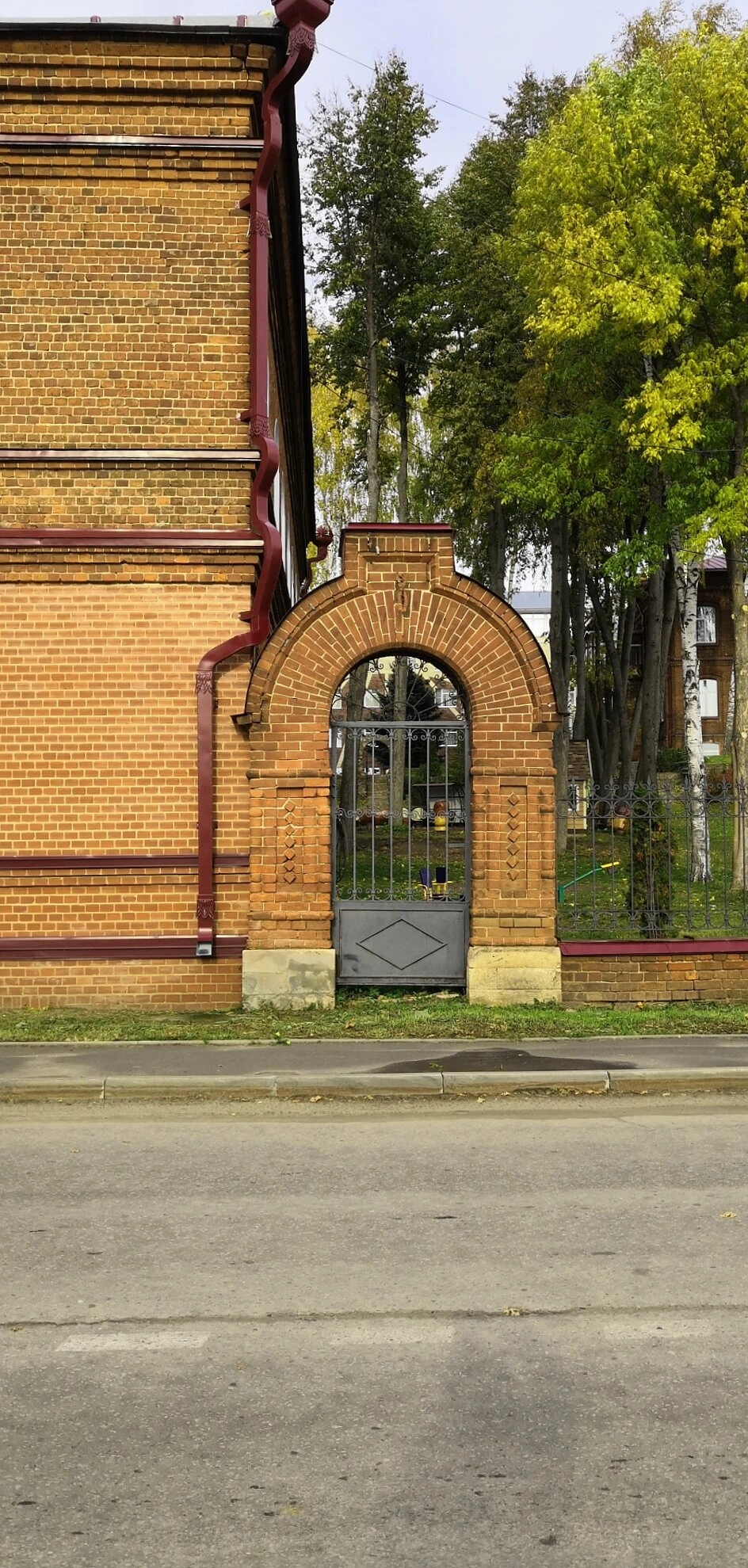 Центральным элементом композиции являются арочные ворота, выполненные из красного кирпича и украшенные металлической решеткой с калиткой. Эти ворота служат символическим переходом от мирской суеты к духовному пространству храма. По сторонам от ворот простирается металлическая ограда, отделяющая святую обитель от окружающего мира.
