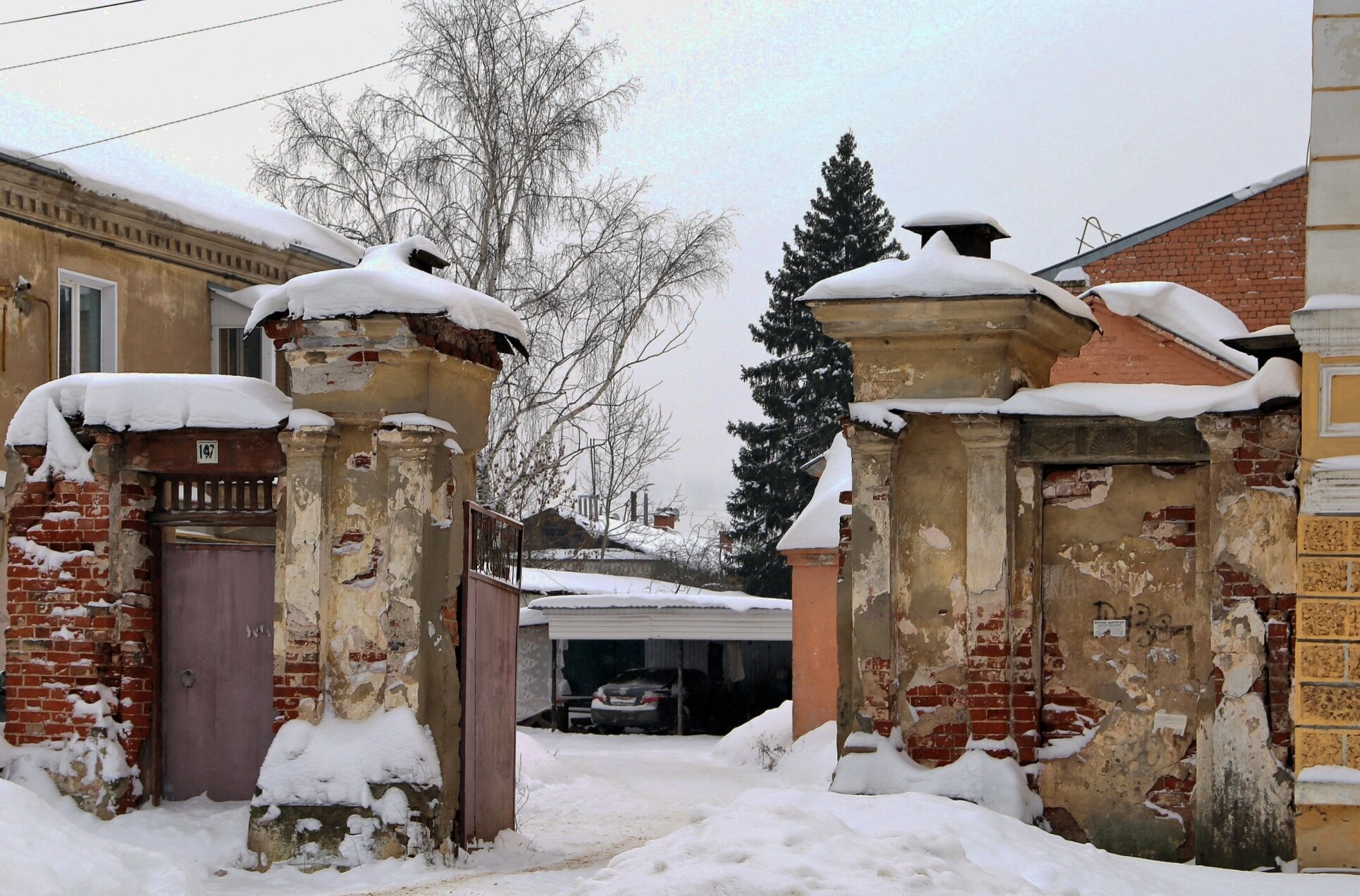 Заснеженная территория за воротами и припаркованный под навесом автомобиль создают контраст между историческим прошлым и современностью. Глубокий снежный покров на земле и кровлях строений однозначно указывает на разгар зимы в Центральной России. На заднем плане виднеются хвойные и лиственные деревья, обрамляющие храмовую территорию.