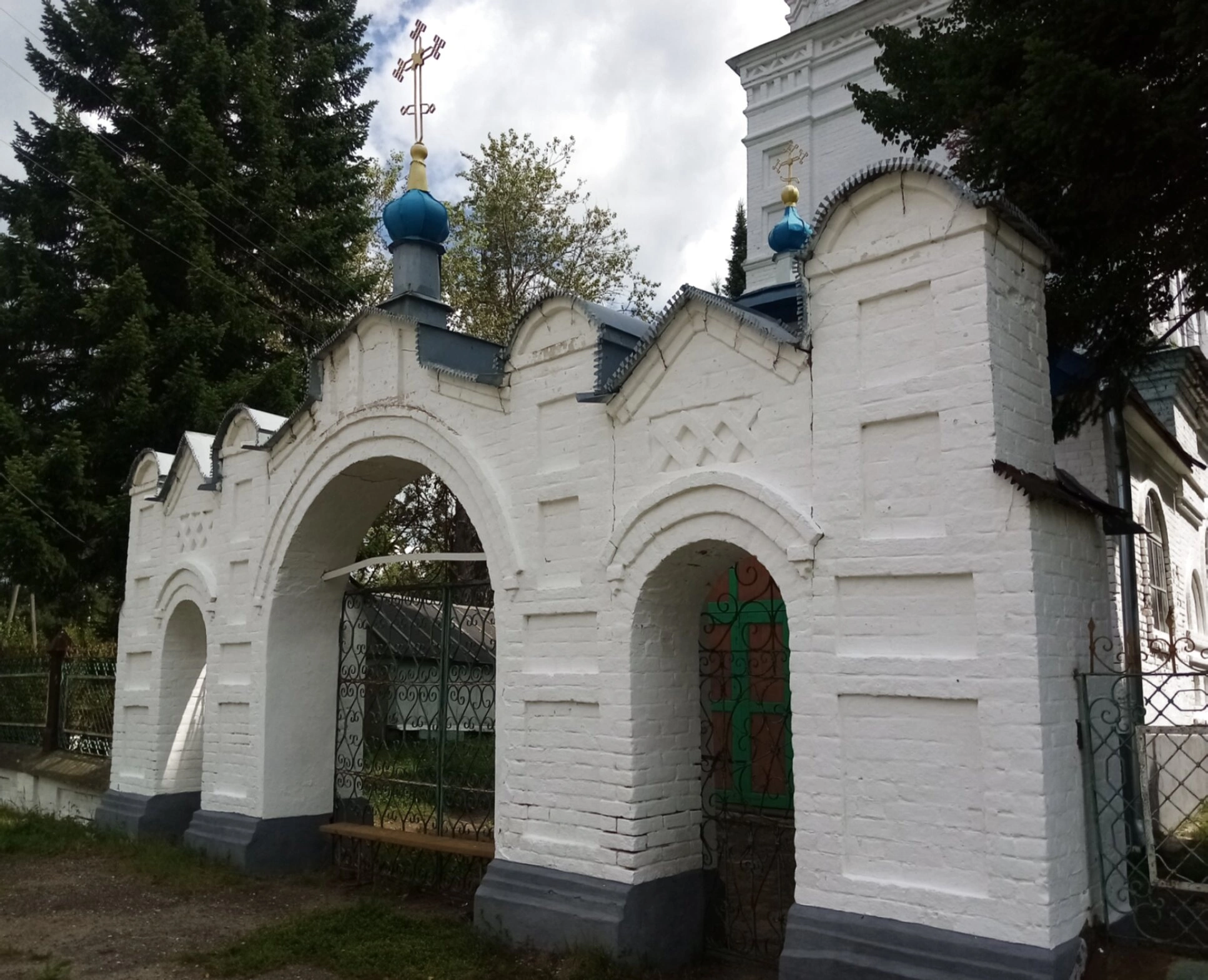 Справа от входа виден фрагмент самого храма, выполненного из белого кирпича, что является характерным для русского церковного зодчества. Чистота и строгость линий ограды подчёркивают благолепие и намоленность этого места. Пышная зелень высоких деревьев на заднем плане создаёт ощущение уединённости и покоя, оберегая тишину и святость церковного двора. Пасмурное небо, запечатлённое в момент съёмки, добавляет кадру особое, созерцательное настроение, напоминая о вечном и бренном.