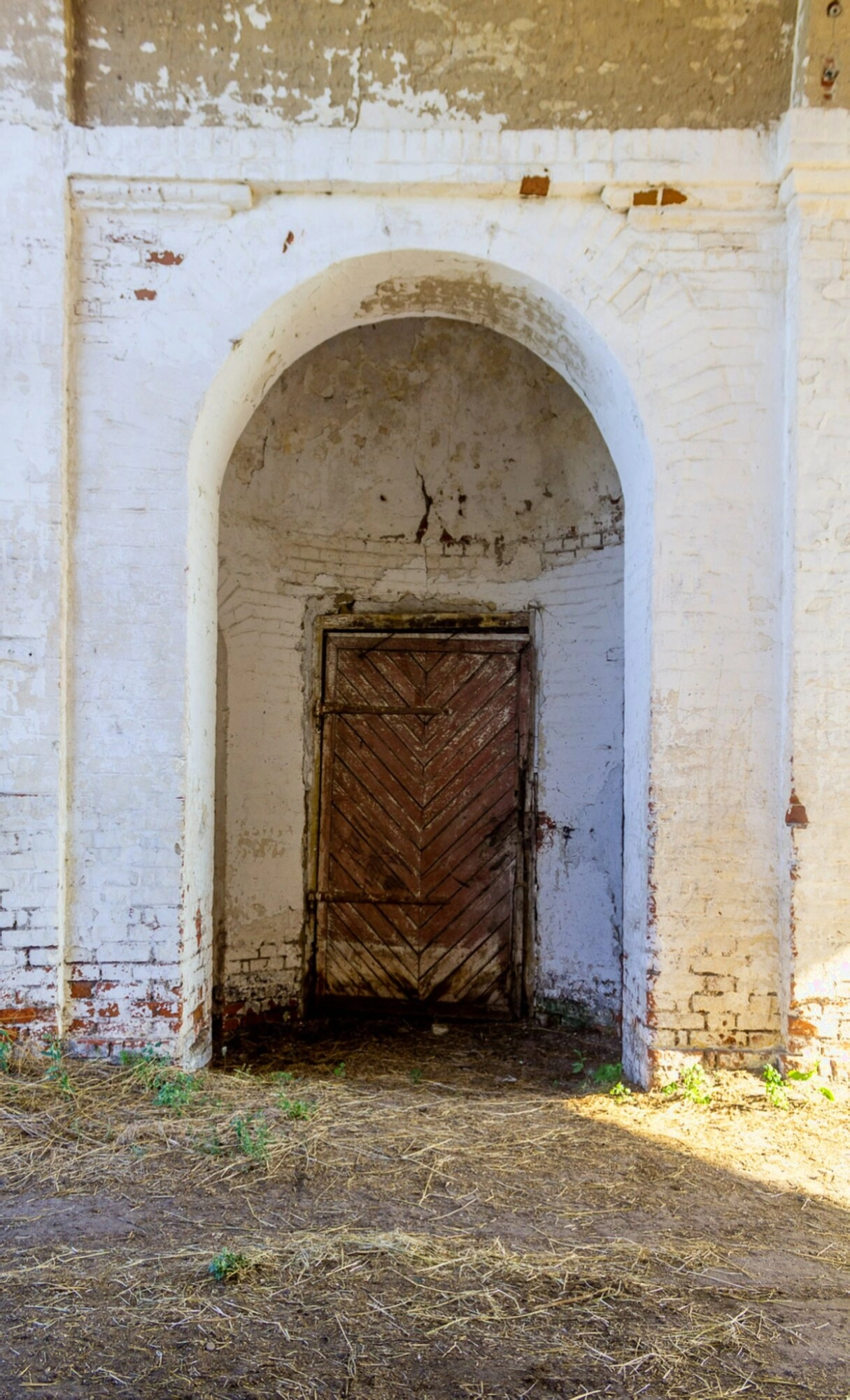 Арочный проем, ведущий в храмовые пределы, сложен из красного кирпича и покрыт слоем белой штукатурки, что символизирует духовную чистоту и благодать. Верхняя часть арки образует полуциркульное завершение, характерное для церковной архитектуры. Штукатурное покрытие демонстрирует следы естественного старения: местами видны участки облупившейся отделки, обнажающие древнюю кирпичную кладку, что придает сооружению особый исторический шарм.