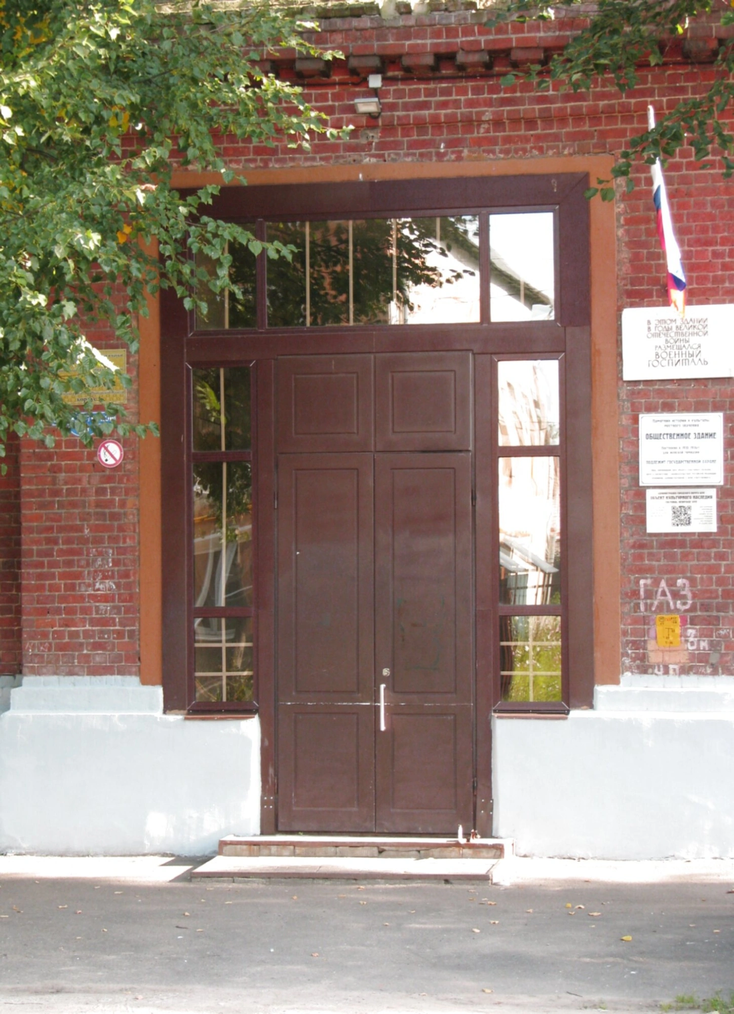 Над входной группой размещена информационная табличка с обозначением "ГАЗ", а также дорожный знак с уточняющей надписью "КРОМЕ ГАЗ". Слева от входа на стене закреплены две информационные таблички, одна из которых содержит текст, а вторая - QR-код для получения дополнительных сведений о храме. Выше расположен государственный флаг Российской Федерации.