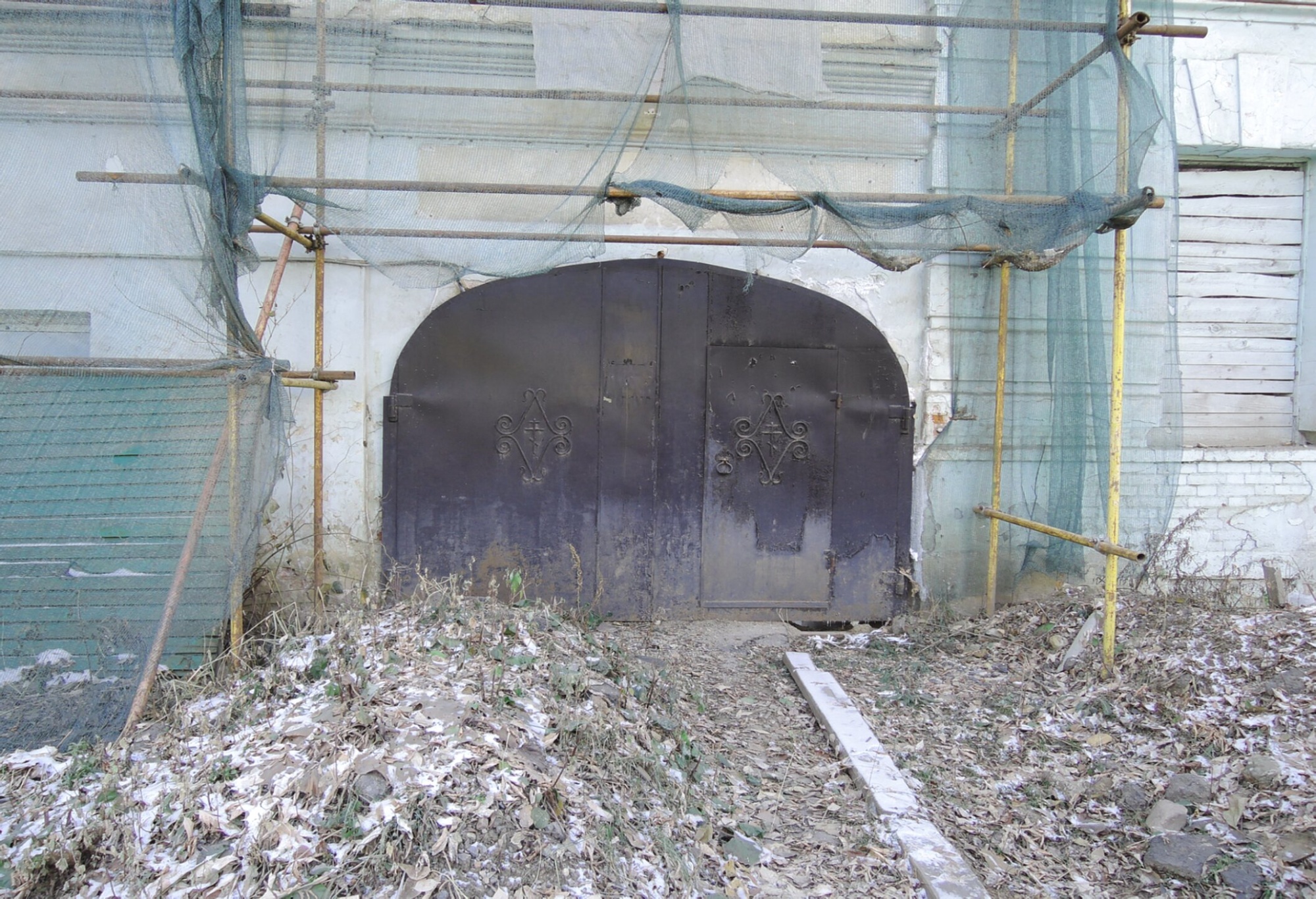 Главным элементом композиции выступает массивная металлическая дверь с арочным завершением, характерным для православного храмового зодчества. На обеих створках входной двери сохранились искусно выполненные кованые узоры, демонстрирующие мастерство русских кузнецов. Фасад здания, выполненный в светлых тонах, местами показывает следы времени через старую штукатурку.